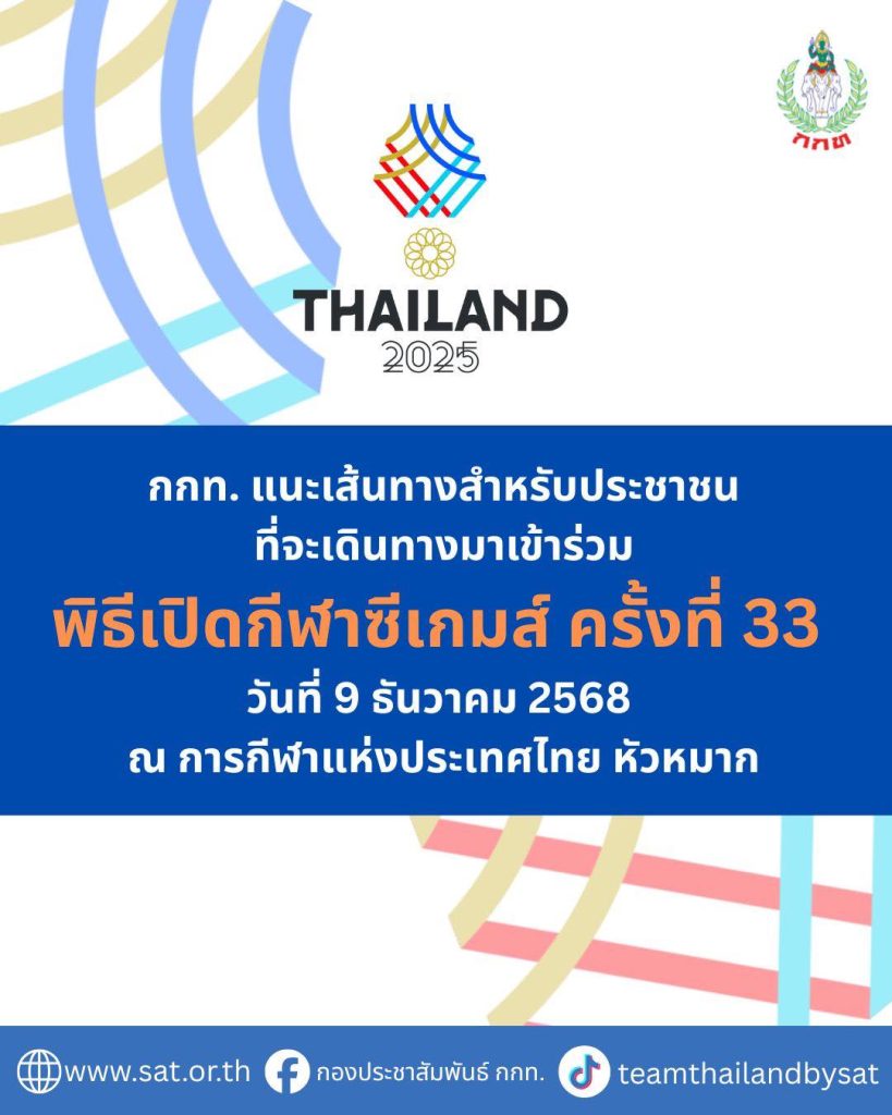 การกีฬาแห่งประเทศไทย อำนวยความสะดวกด้านการเดินทางสำหรับประชาชนที่จะเข้าร่วมพิธีเปิดการแข่งขันกีฬาซีเกมส์ ครั้งที่ 33 ในวันที่ 9 ธันวาคม 2568 ณ ราชมังคลากีฬาสถาน หัวหมาก