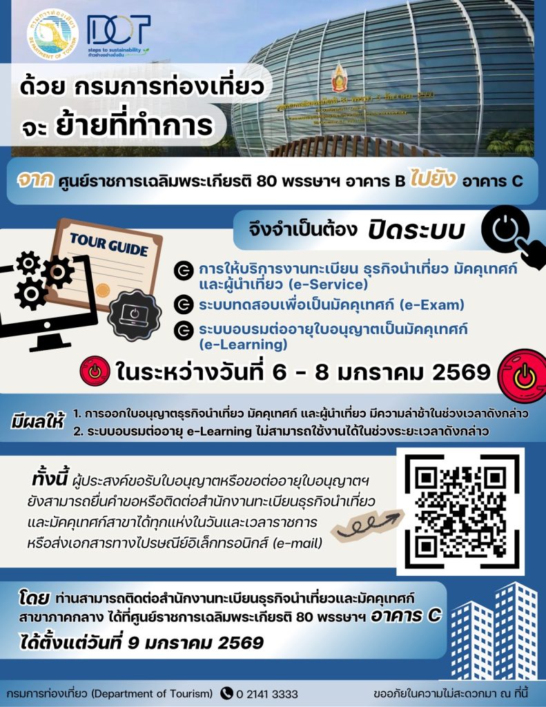 กรมการท่องเที่ยว ประกาศปิดระบบให้บริการด้านทะเบียนธุรกิจนำเที่ยว มัคคุเทศก์ และผู้นำเที่ยว (e-Service) รวมถึงระบบ e-Exam และ e-Learning ระหว่างวันที่ 6 – 8 มกราคม 2569 เนื่องจากย้ายสำนักงานจากอาคาร B ไปยังอาคาร C ศูนย์ราชการเฉลิมพระเกียรติ 80 พรรษาฯ