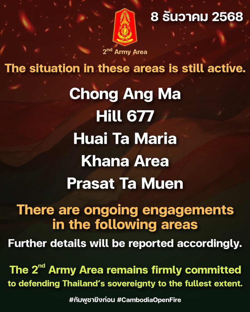 December 8, 2025 2nd Army Area The situation in these areas is still active. Chong Ang Ma Hill 677 Huai Ta Maria Khana Area Prasat Ta Muen There are ongoing engagements in the following areas Further details will be reported accordingly.
