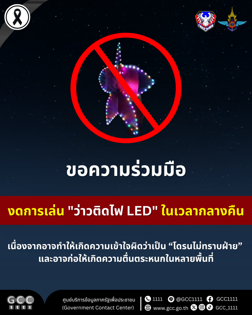 กองบิน 21 ขอความร่วมมือ งดการเล่น “ว่าวติดไฟ LED” ในเวลากลางคืน เพราะอาจจะทำให้เกิดความเข้าใจผิด คิดว่าเป็น “โดรนไม่ทราบฝ่าย” สร้างความตื่นตระหนกในหลายพื้นที่