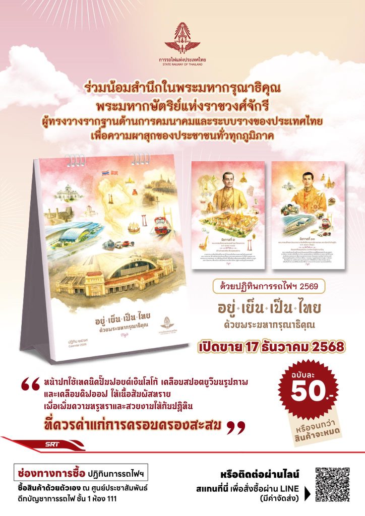 การรถไฟแห่งประเทศไทย ขอเชิญร่วมเป็นเจ้าของปฏิทินตั้งโต๊ะ ปี 2569 ฉบับละ 50 บาท ร่วมน้อมสำนึกในพระมหากรุณาธิคุณ แห่งพระมหากษัตริย์แห่งราชวงศ์จักรี ผู้ทรงวางรากฐานด้านการคมนาคมและระบบรางของประเทศไทย เพื่อประโยชน์สุขของประชาชนทั่วทุกภูมิภาคมาอย่างยาวนาน เริ่มจำหน่ายวันที่ 17 ธันวาคม 2568 เวลา 07.00 น. เป็นต้นไป