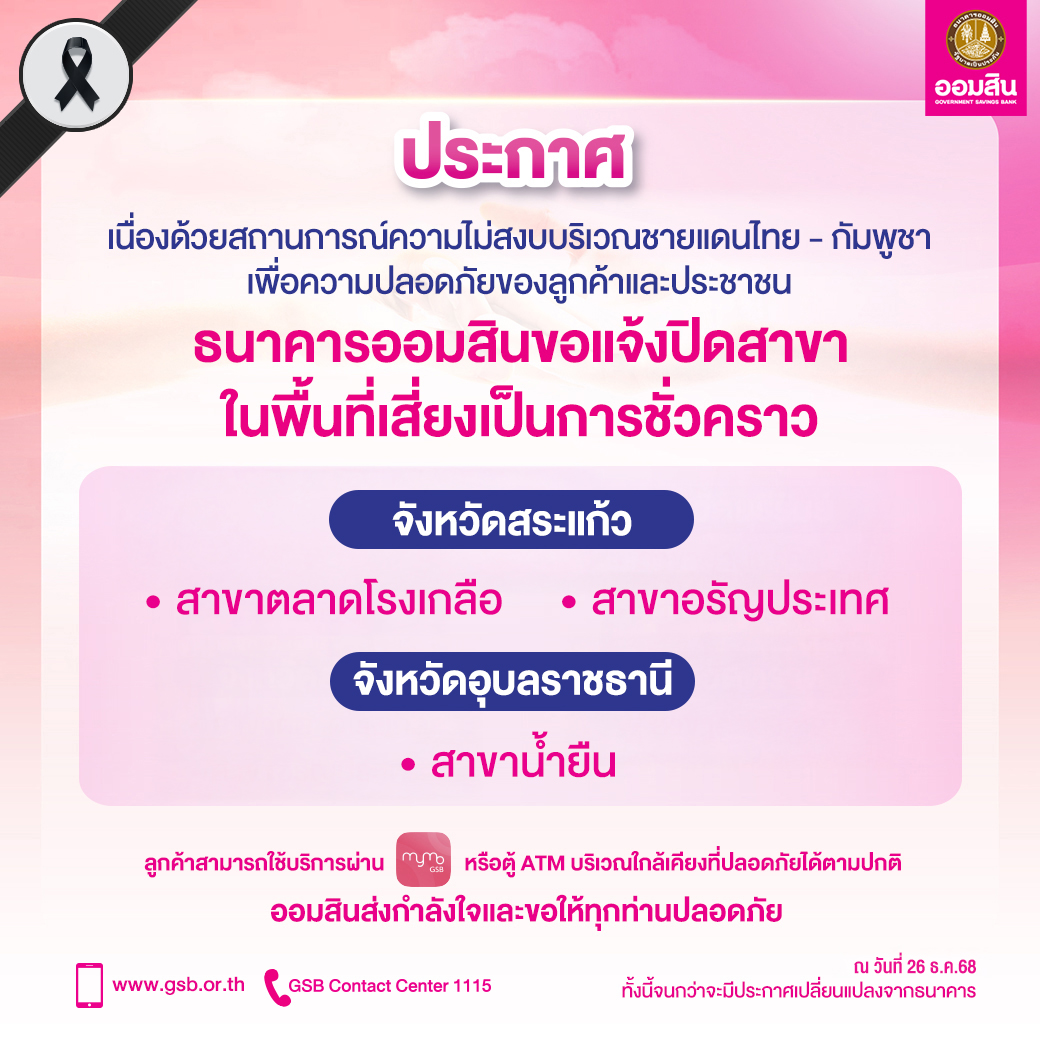 ธนาคารออมสิน ประกาศปิดสาขาในพื้นที่เสี่ยงชายแดนไทย – กัมพูชาเป็นการชั่วคราว เนื่องด้วยสถานการณ์ความไม่สงบบริเวณชายแดนไทย – กัมพูชา เพื่อความปลอดภัยของลูกค้าและประชาชน