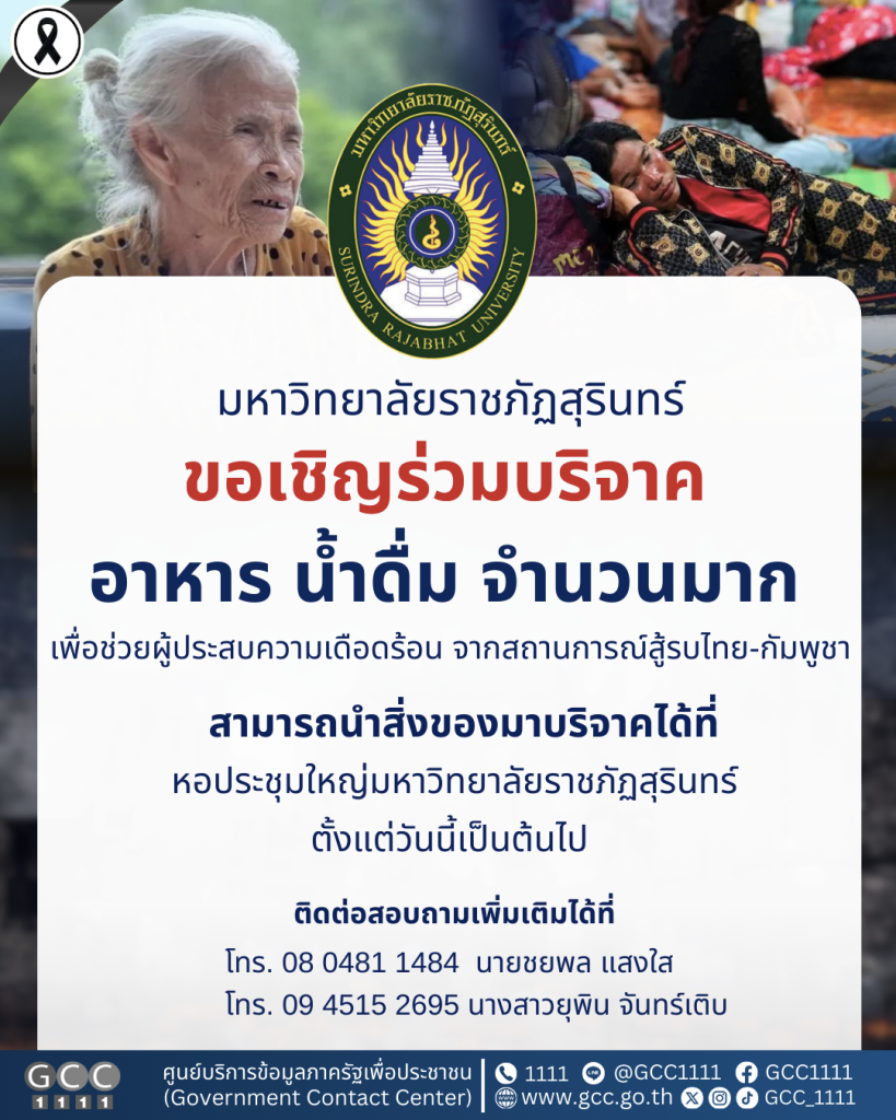 มหาวิทยาลัยราชภัฏสุรินทร์ ขอเชิญร่วมบริจาคเพื่อช่วยผู้ประสบความเดือดร้อน ข่าวสารกิจกรรม มหาวิทยาลัยราชภัฏสุรินทร์ ขอเชิญร่วมบริจาคเพื่อช่วยผู้ประสบความเดือดร้อน มหาวิทยาลัยราชภัฏสุรินทร์ ขอเชิญร่วมบริจาคเพื่อช่วยผู้ประสบความเดือดร้อน ขณะนี้ผู้อพยพส่วนใหญ่ซึ่งเป็นผู้สูงอายุ และเด็ก ต้องการอาหาร น้ำดื่ม สิ่งของเครื่องอุปโภคบริโภคและยากันยุง จำนวนมาก จึงขอเชิญร่วมบริจาคเพื่อช่วยผู้ประสบความเดือดร้อนสามารถนำสิ่งของมาบริจาคได้ที่หอประชุมใหญ่มหาวิทยาลัยราชภัฏสุรินทร์ตั้งแต่วันนี้เป็นต้นไป ขอเชิญชวนทุกท่านร่วมส่งต่อกำลังใจและความช่วยเหลือให้ถึงมือผู้ที่ต้องการอย่างแท้จริง น้ำใจเล็ก ๆ ของท่าน มีค่ามหาศาลสำหรับพวกเขาในยามยากลำบาก หากมีความประสงค์ที่จะเปิดโรงทาน สามารถแจ้งทางมหาวิทยาลัยได้ทันที่ โดยจะจัดพื้นที่ไว้ให้ติดต่อสอบถามเพิ่มเติมได้ที่โทร. 08 0481 1484 นายชยพล แสงใสโทร. 09 4515 2695 นางสาวยุพิน จันทร์เติบ ที่มา Facebook องค์การบริหารนักศึกษา Surindra Rajabhat University Post Views: 42 FacebookFacebookXTwitterLINELine