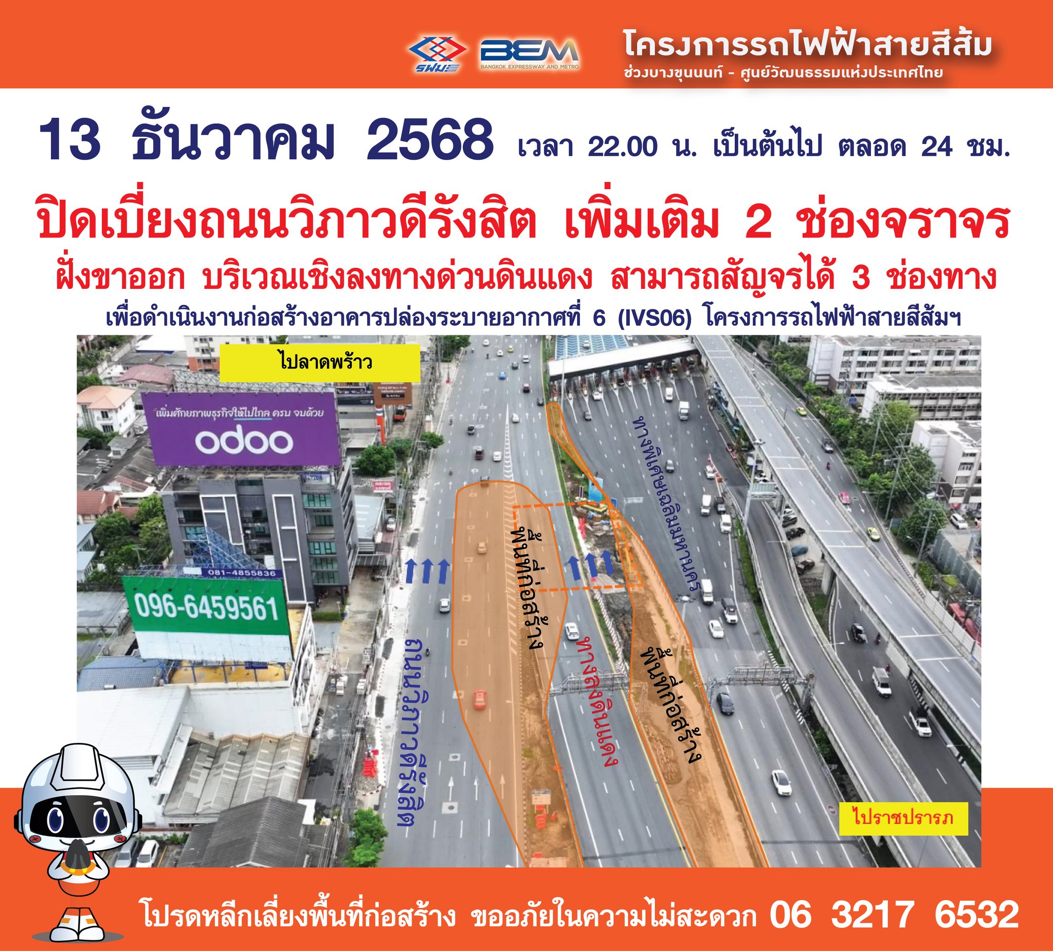 รฟม. แจ้งปิดเบี่ยงจราจรบนถนนวิภาวดีรังสิตเพิ่มเติม เพื่อก่อสร้างโครงการรถไฟฟ้าสายสีส้มฯ วันที่ 13 ธ.ค. 68