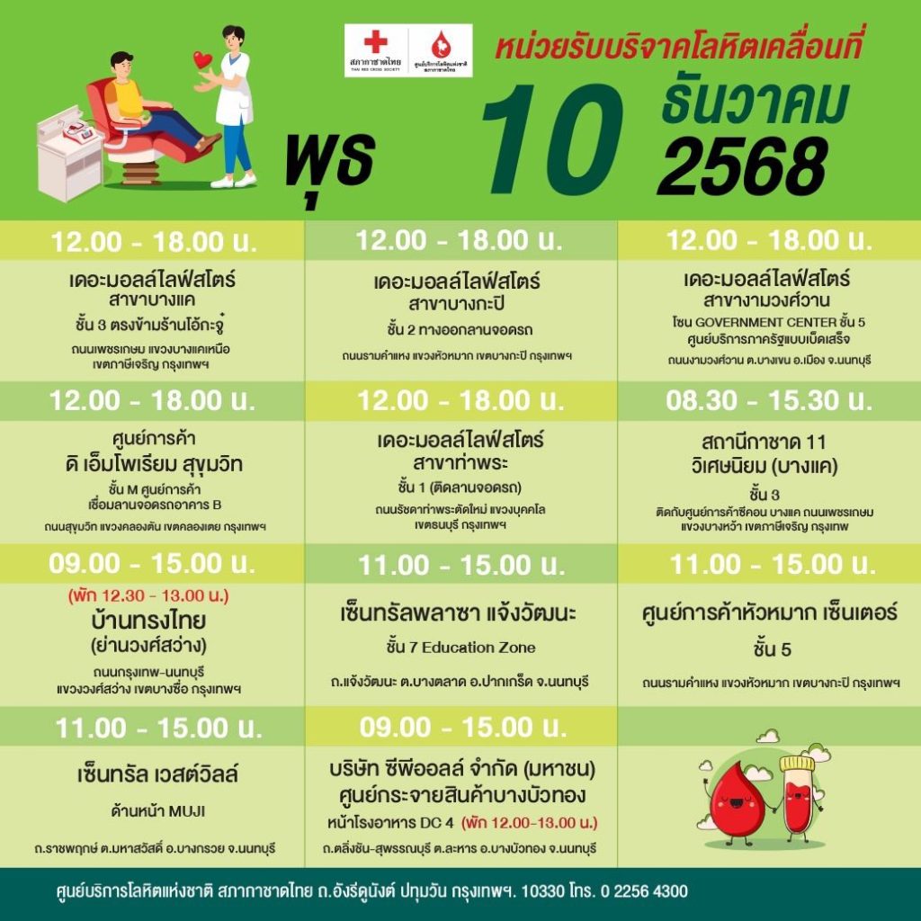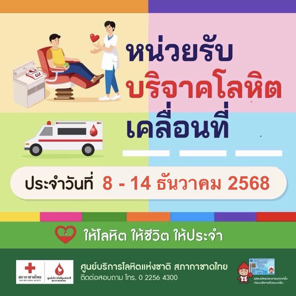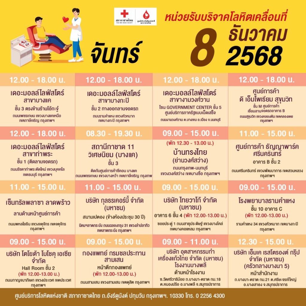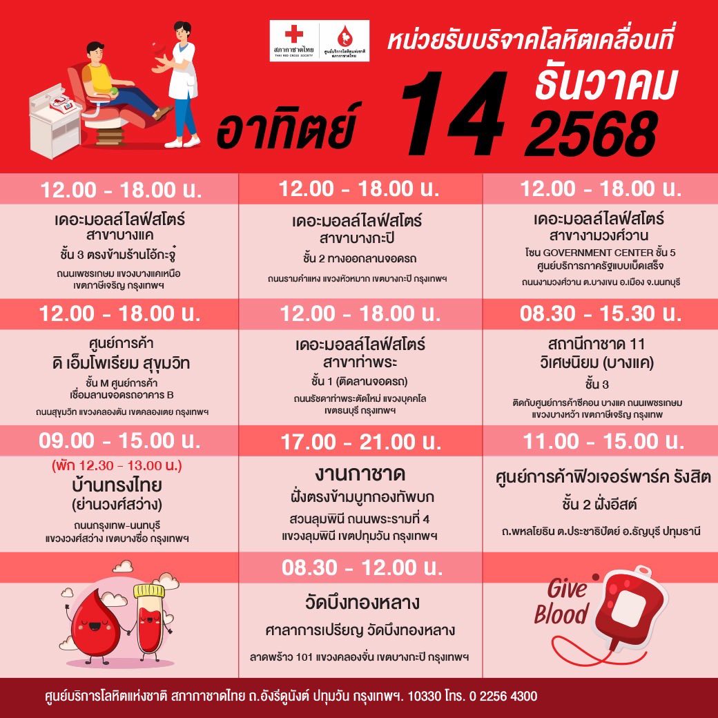 สภากาชาดไทย ออกหน่วยรับบริจาคโลหิตเคลื่อนที่ ประจำวันที่ 8 – 14 ธันวาคม 2568