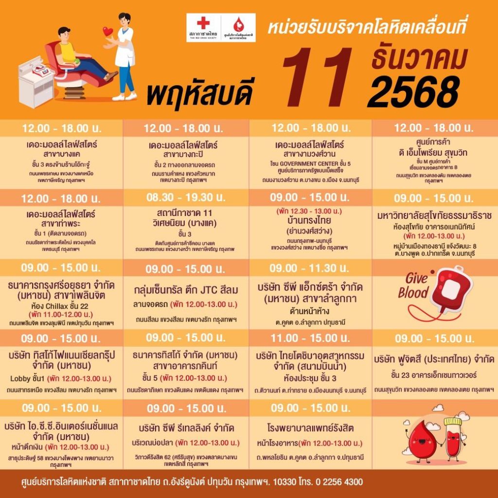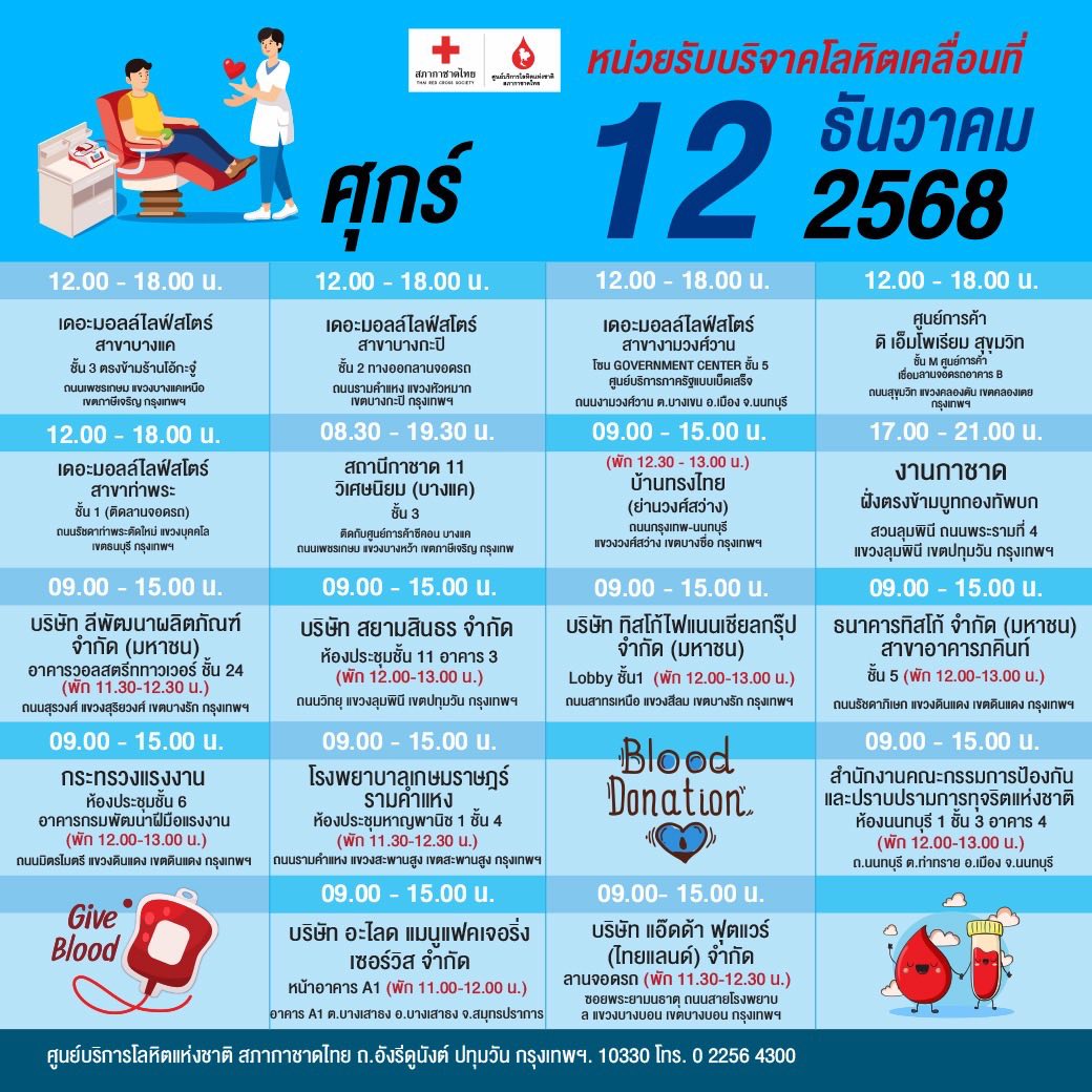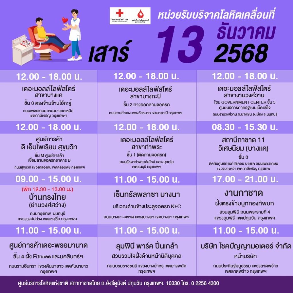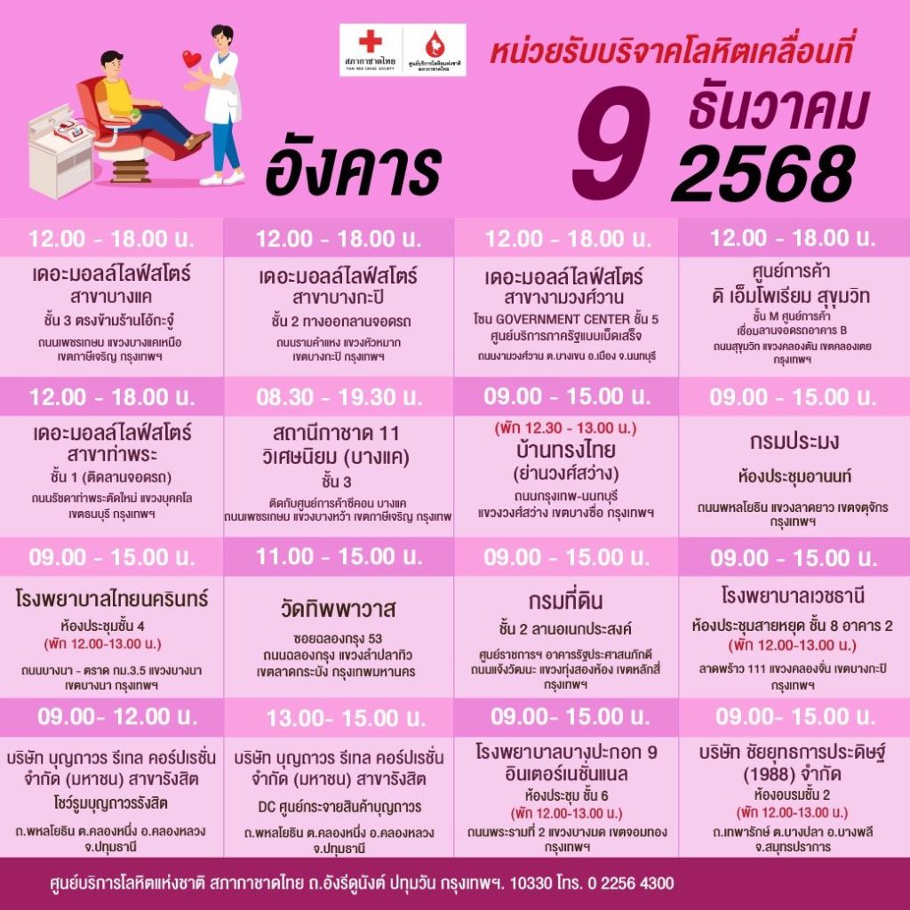 สภากาชาดไทย ออกหน่วยรับบริจาคโลหิตเคลื่อนที่ ประจำวันที่ 8 – 14 ธันวาคม 2568