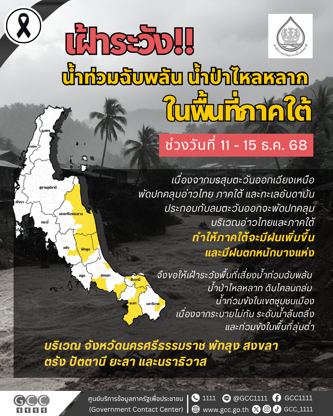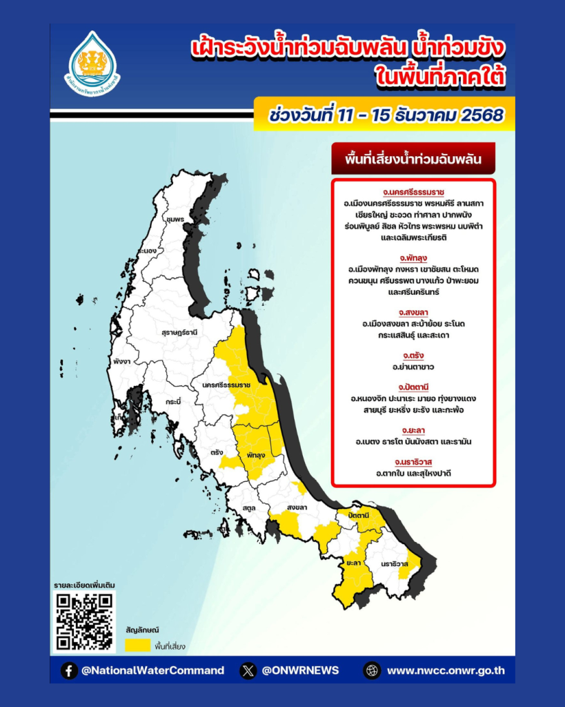 สำนักงานทรัพยากรน้ำแห่งชาติ ประกาศเฝ้าระวังน้ำท่วมฉับพลัน น้ำป่าไหลหลาก พื้นที่ภาคใต้ ช่วง 11 – 15 ธ.ค. 68 ข่าวสารกิจกรรม, สาธารณภัย สำนักงานทรัพยากรน้ำแห่งชาติ ประกาศเฝ้าระวังน้ำท่วมฉับพลัน น้ำป่าไหลหลาก พื้นที่ภาคใต้ ช่วง 11 – 15 ธ.ค. 68 สำนักงานทรัพยากรน้ำแห่งชาติ ประกาศเฝ้าระวังน้ำท่วมฉับพลัน น้ำป่าไหลหลาก ในพื้นที่ภาคใต้ ในช่วงวันที่ 11 – 15 ธันวาคม 2568 เนื่องจากมรสุมตะวันออกเฉียงเหนือพัดปกคลุมอ่าวไทย ภาคใต้ และทะเลอันดามัน ประกอบกับลมตะวันออกจะพัดปกคลุมบริเวณอ่าวไทยและภาคใต้ ทำให้ภาคใต้จะมีฝนเพิ่มขึ้นและมีฝนตกหนักบางแห่ง จึงขอให้เฝ้าระวังพื้นที่เสี่ยงน้ำท่วมฉับพลัน น้ำป้าไหลหลาก ดินโคลนถล่ม น้ำท่วมขังในเขตชุมชนเมือง เนื่องจากระบายไม่ทัน และระดับน้ำล้นตลิ่งและท่วมขังในพื้นที่ลุ่มต่ำ บริเวณ จังหวัดนครศรีธรรมราช พัทลุง สงขลา ตรัง ปัตตานี ยะลา และนราธิวาส ที่มา : Facebook สำนักงานทรัพยากรน้ำแห่งชาติ Post Views: 17 FacebookFacebookXTwitterLINELine