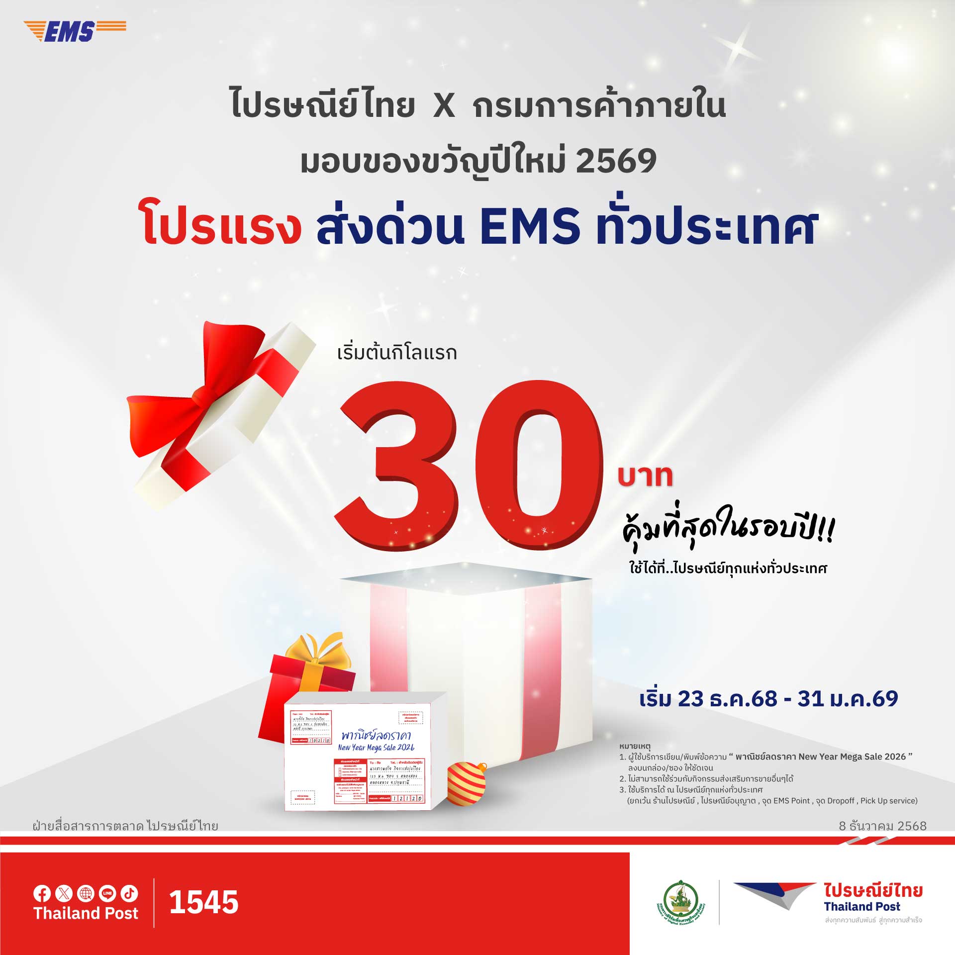 ไปรษณีย์ไทย X กรมการค้าภายใน มอบโปรส่งด่วน EMS ต้อนรับปีใหม่ 2569