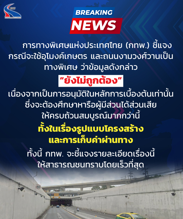 กทพ. ชี้แจงกรณีจะใช้อุโมงค์เกษตร และถนนงามวงศ์วานเป็นทางพิเศษ เป็นเพียงการศึกษาเบื้องต้น