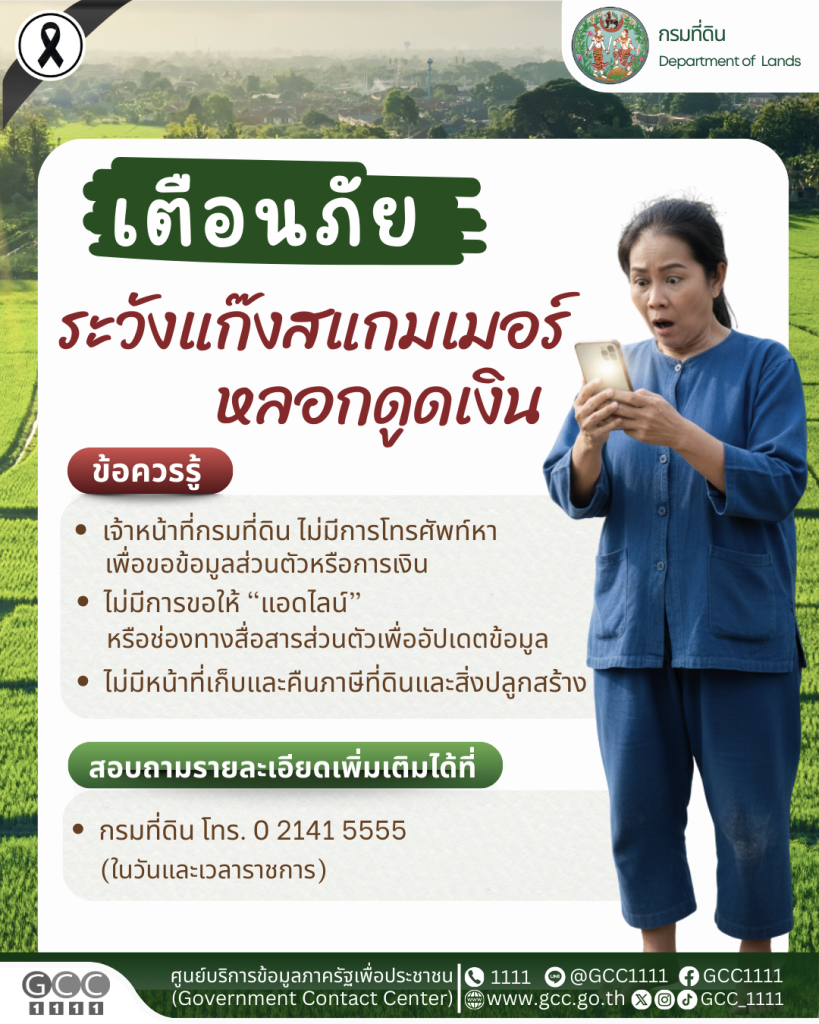 กรมที่ดิน เตือนภัยระวังอย่าหลงเชื่อแก๊งสแกมเมอร์ หลอกดูดเงิน