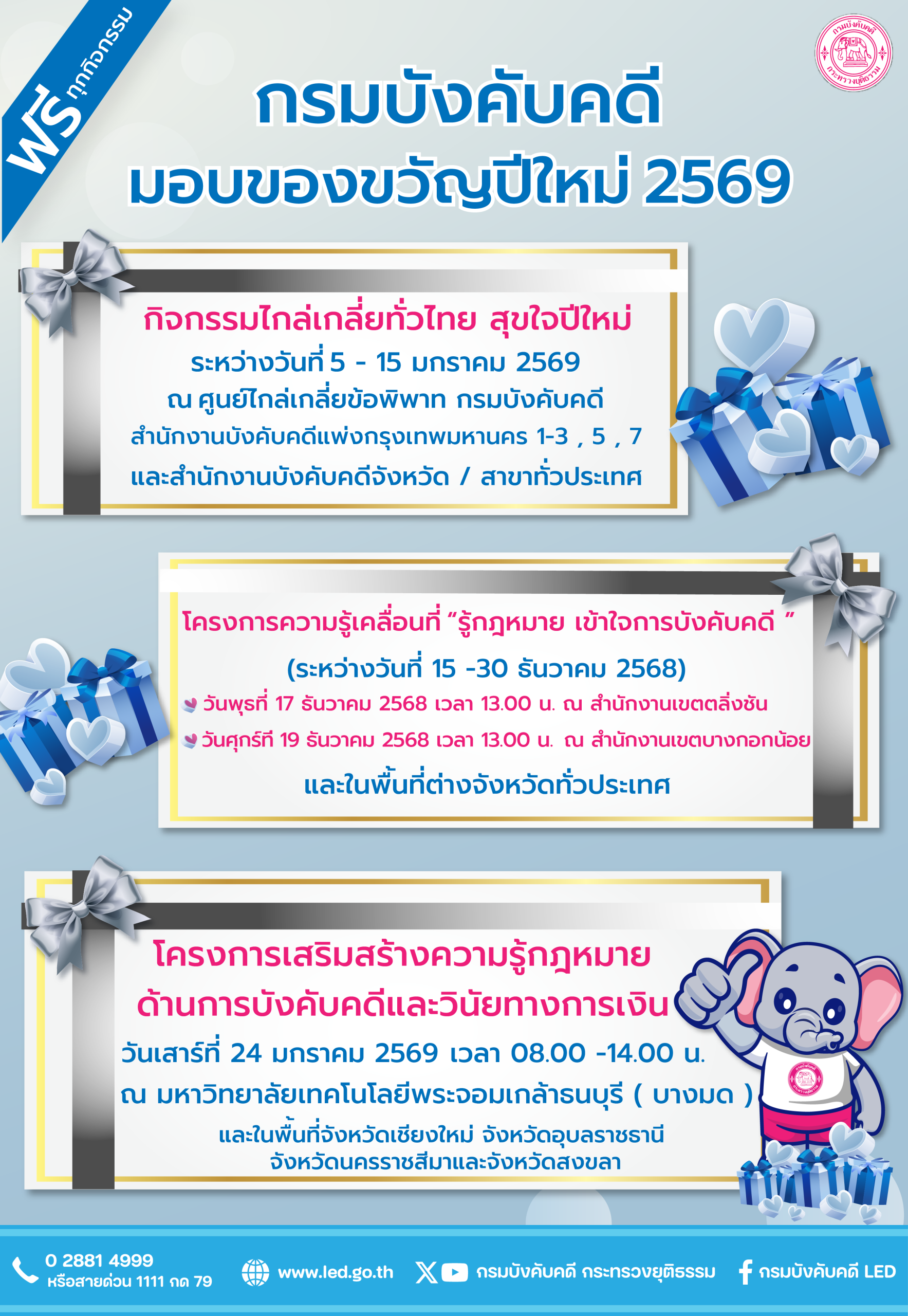 กรมบังคับคดี มอบของขวัญปีใหม่ 2569 ประกอบด้วย กิจกรรมไกล่เกลี่ยทั่วไทย สุขใจปีใหม่ , โครงการความรู้เคลื่อนที่ “รู้กฎหมาย เข้าใจการบังคับคดี” และ โครงการเสริมสร้างความรู้กฎหมายด้านการบังคับคดีและวินัยทางการเงิน โดยให้บริการฟรีทุกกิจกรรม
