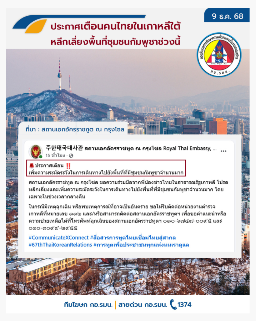 กอ.รมน. ประกาศเตือนคนไทยในสาธารณรัฐเกาหลีใต้ หลีกเลี่ยงการเดินทางไปยังพื้นที่ชุมชนกัมพูชา