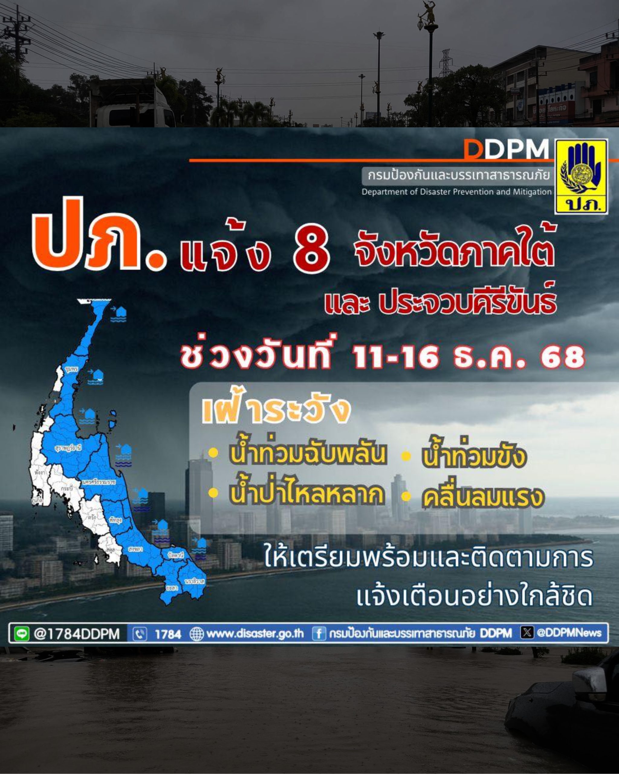 กรมป้องกันและบรรเทาสาธารณภัย ประกาศเตือน 8 จังหวัดภาคใต้ ได้แก่ ชุมพร สุราษฎร์ธานี นครศรีธรรมราช พัทลุง สงขลา ปัตตานี ยะลา นราธิวาส ภาคกลาง : จ.ประจวบคีรีขันธ์ ให้เฝ้าระวังน้ำท่วมฉับพลัน น้ำป่าไหลหลากและน้ำท่วมขังระหว่างวันที่ 11–16 ธ.ค. 68