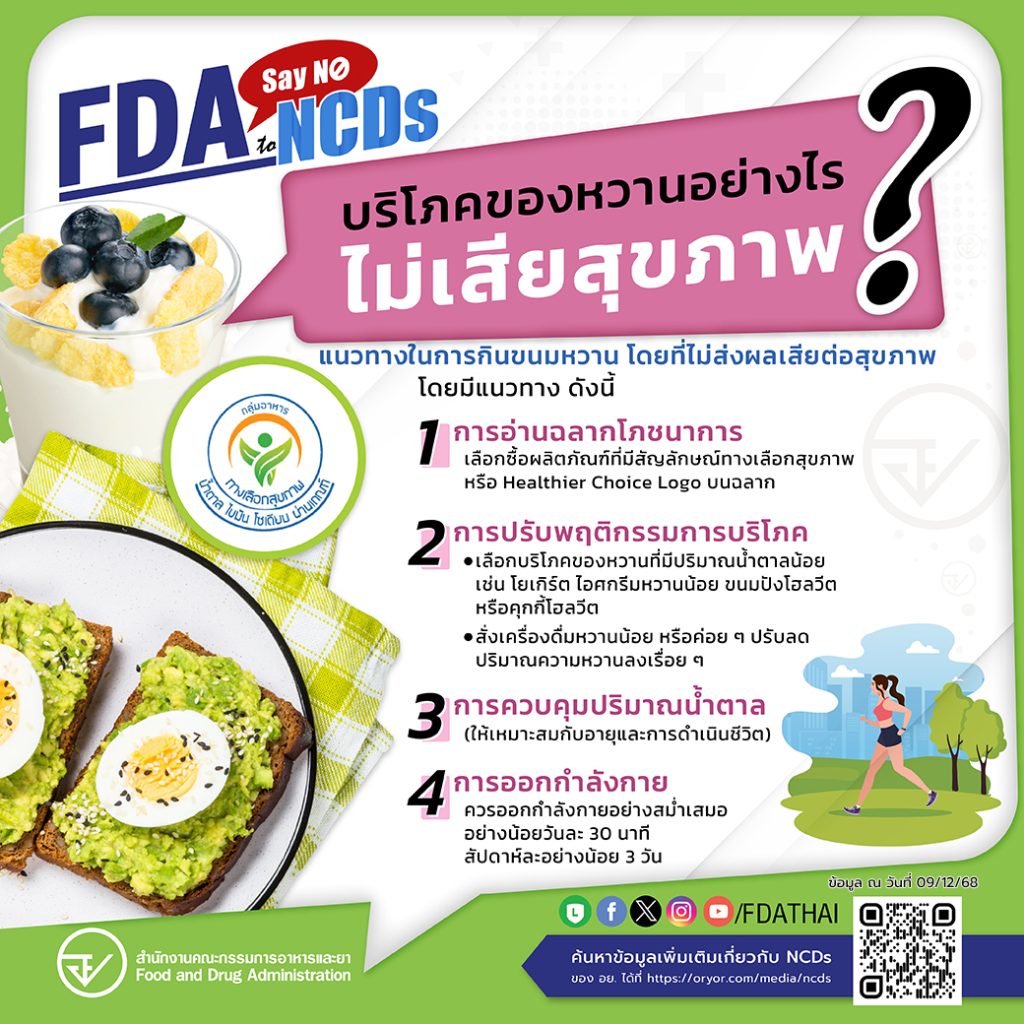 อย. ร่วมขับเคลื่อนนโยบายกระทรวงสาธารณสุขร่วมรณรงค์ให้คนไทยมีความรอบรู้ เพื่ออยู่อย่างมีคุณภาพชีวิต FDA Say No to NCDs วันนี้ อย. พามาให้ความรู้เรื่อง บริโภคของหวานอย่างไรไม่เสียสุขภาพ