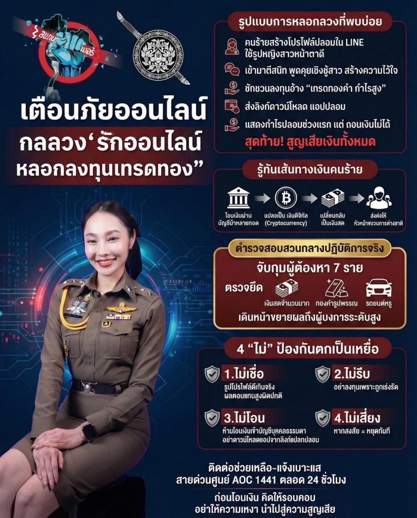 สำนักงานตำรวจแห่งชาติ แจ้งเตือนประชาชนให้ระวังกลุ่มมิจฉาชีพใช้กลลวงรูปแบบ “รักออนไลน์ ชวนลงทุน” โดยมิจฉาชีพมักสร้างโปรไฟล์ปลอม ใช้รูปบุคคลหน้าตาดีเข้าตีสนิทในเชิงชู้สาว ก่อนชักชวนให้ลงทุนอ้างว่าเป็นการ “เทรดทองให้ผลตอบแทนสูง” พร้อมหลอกให้ดาวน์โหลดแอปปลอมที่แสดงผลกำไรเกินจริง สุดท้ายไม่สามารถถอนเงินได้และสูญเสียทรัพย์สิน