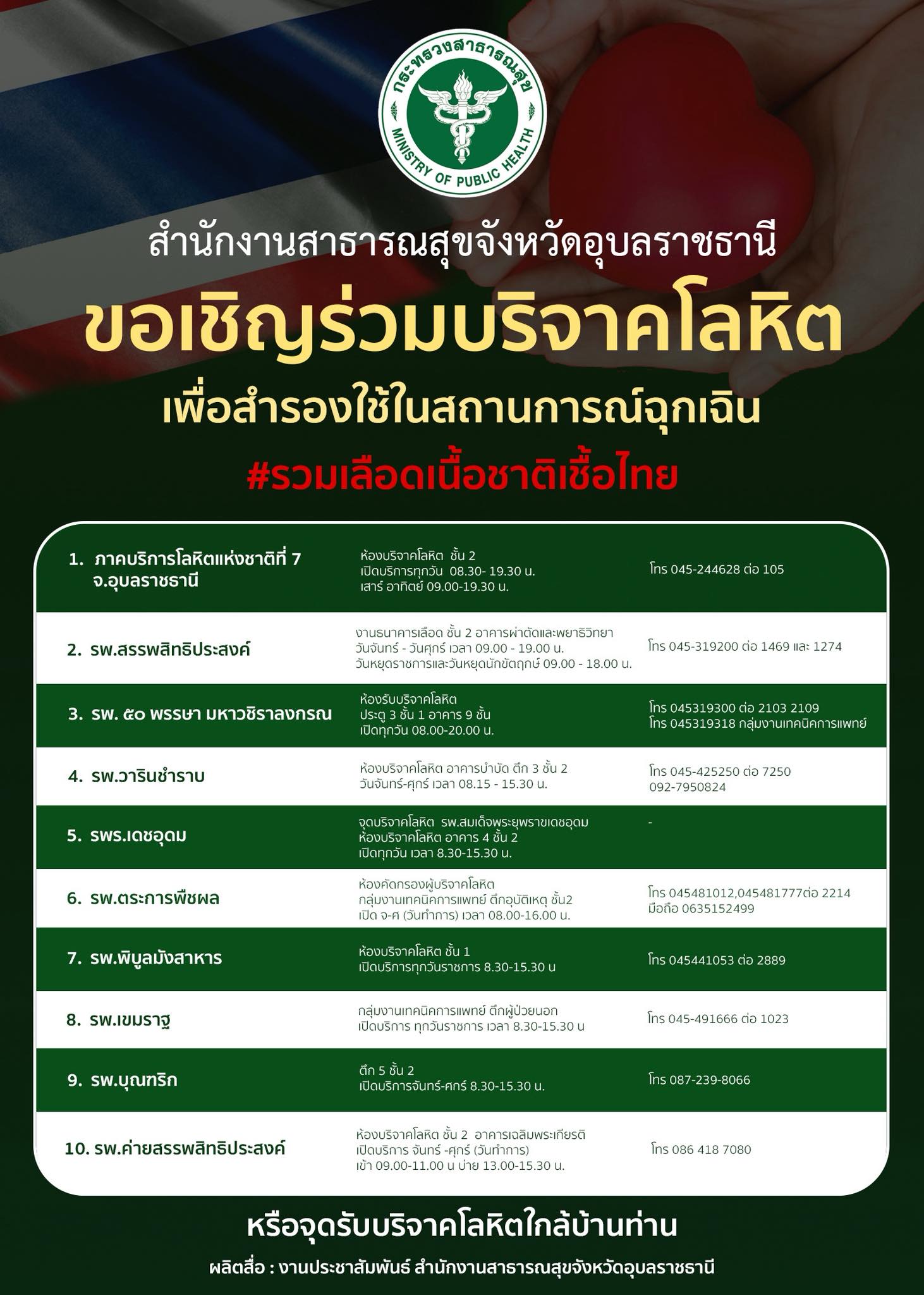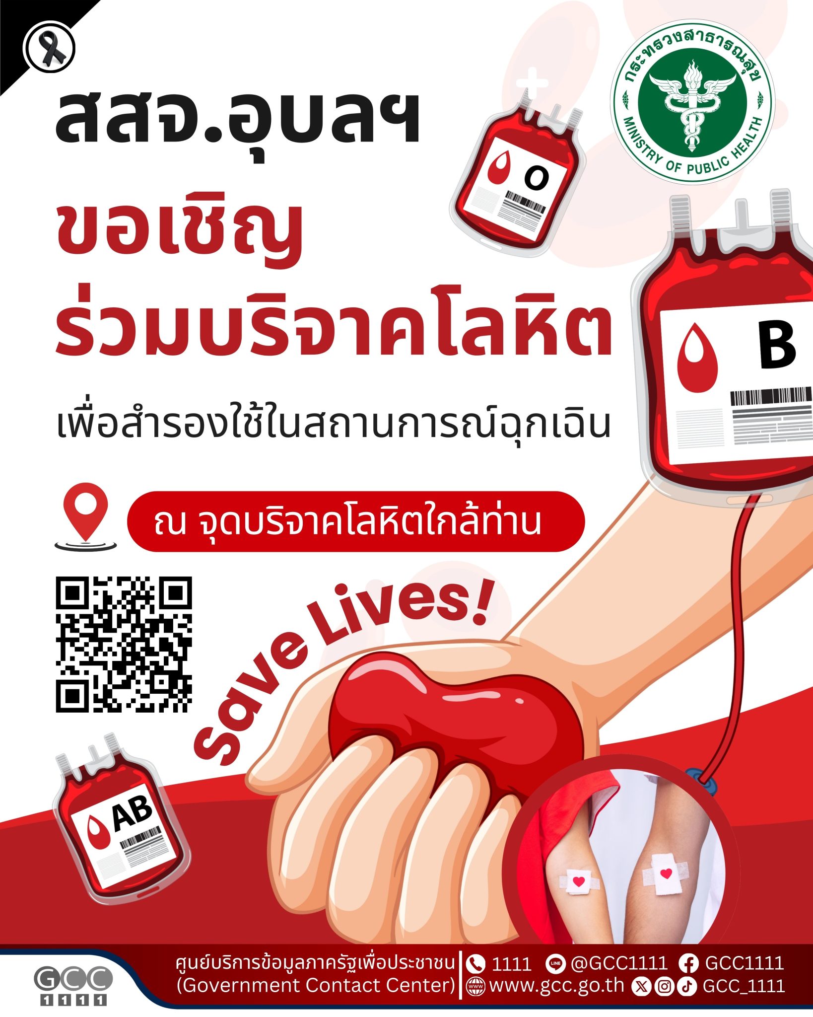 สำนักงานสาธารณสุขอุบลราชธานี ขอเชิญร่วมบริจาคโลหิตสำรองใช้ในสถานการณ์ฉุกเฉิน