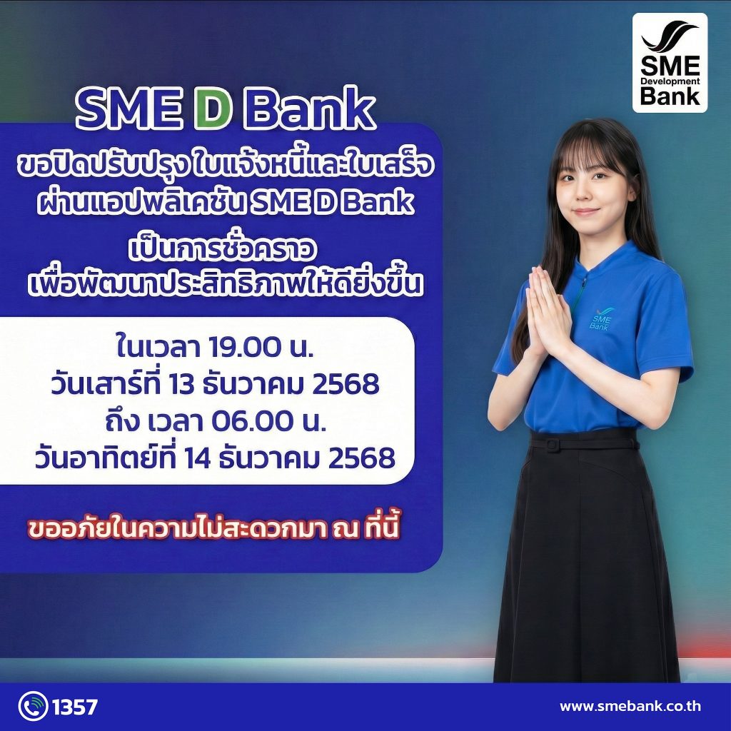 SME D Bank แจ้งปิดปรับปรุงการให้บริการขอรับใบแจ้งหนี้และใบเสร็จ แอปพลิเคชัน SME D Bank 13 ธ.ค. 68 ข่าวสารกิจกรรม, ติดต่อหน่วยงานภาครัฐ SME D Bank แจ้งปิดปรับปรุงการให้บริการขอรับใบแจ้งหนี้และใบเสร็จ แอปพลิเคชัน SME D Bank 13 ธ.ค. 68 แอปพลิเคชัน SME D Bank จะดำเนินการปรับปรุงการให้บริการขอรับใบแจ้งหนี้และใบเสร็จ ผ่านแอปพลิเคชัน SME D Bankในระหว่างวันที่ 13 – 14 ธันวาคม 2568เวลา 19.00 – 06.00 น.ซึ่งมีผลทำให้ไม่สามารถขอรับใบแจ้งหนี้และใบเสร็จ ผ่านแอปพลิเคชัน SME D Bank ได้ ในเวลาดังกล่าวและจะสามารถใช้บริการได้อีกครั้งในวันที่ 14 ธันวาคม 2568 ตั้งแต่เวลา 06.00 น. เป็นต้นไปขออภัยในความไม่สะดวกมา ณ ที่นี้ ที่มา : Facebook ธนาคารพัฒนาวิสาหกิจขนาดกลางและขนาดย่อมแห่งประเทศไทย Post Views: 4 FacebookFacebookXTwitterLINELine