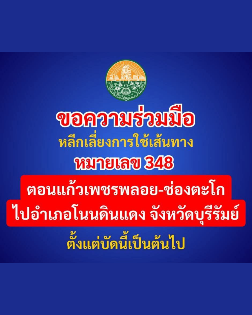 จังหวัดสระแก้ว ขอความร่วมมือประชาชน “งดใช้เส้นทางสาย 348 ตอน แก้วเพชรพลอย-ช่องตะโก” ชั่วคราว หลังสถานการณ์ชายแดนตึงเครียดขึ้น