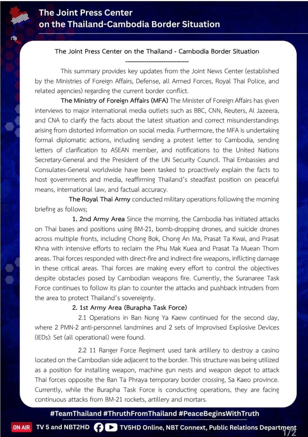 ศูนย์แถลงข่าวร่วมสถานการณ์ชายแดนไทย – กัมพูชา ขอรายงานความคืบหน้าสถานการณ์ ในภาพรวม เพื่อให้ประชาชนและสื่อมวลชนได้รับทราบข้อมูลที่ถูกต้อง ครบถ้วน และเป็นปัจจุบัน ดังนี้