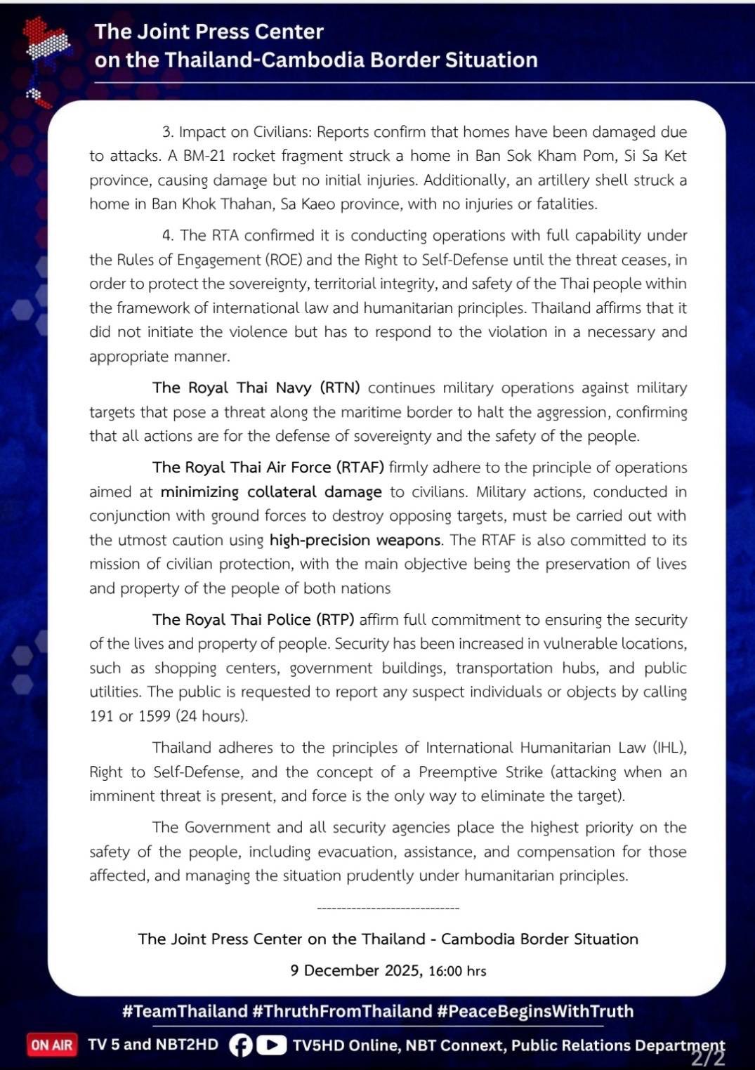 ศูนย์แถลงข่าวร่วมสถานการณ์ชายแดนไทย – กัมพูชา รายงานความคืบหน้าสถานการณ์ภาพรวม วันที่ 9 ธันวาคม 2568 เวลา 16.00 น.
