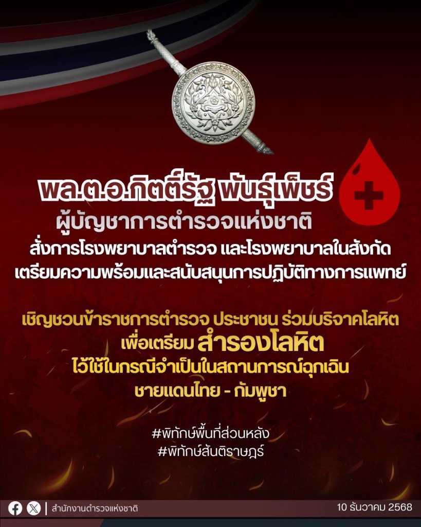 โรงพยาบาลตำรวจ และโรงพยาบาลในสังกัด เตรียมความพร้อมและสนับสนุนการปฏิบัติทางการแพทย์ พร้อมเชิญชวนข้าราชการตำรวจ ประชาชน ร่วมบริจาคโลหิต เพื่อเตรียมสำรองโลหิตไว้ในกรณีหากจำเป็นต้องใช้ในสถานการณ์ฉุกเฉินในสถานการณ์ฉุกเฉินชายแดนไทย – กัมพูชา