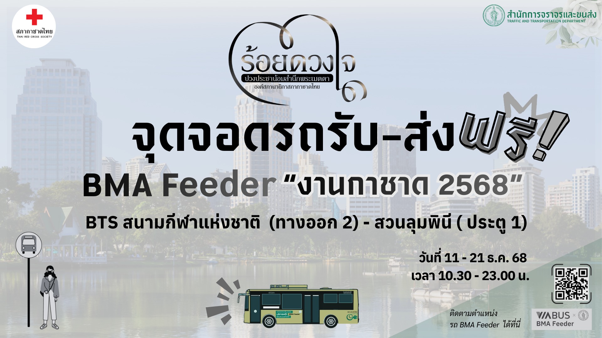 กรุงเทพมหานคร โดยสำนักการจราจรและขนส่ง (สจส.) จัดให้บริการรถรับ–ส่งฟรี “BMA Feeder” เพื่ออำนวยความสะดวกด้านการเดินทางให้แก่ประชาชนที่เข้าร่วมงานกาชาดประจำปี 2568 โดยเปิดให้บริการในช่วงวันที่ 11–21 ธันวาคม 2568 ระหว่างเวลา 10.30–23.00 น. ให้บริการทุก 30 นาที ด้วยรถโดยสาร 3 – 4 คัน