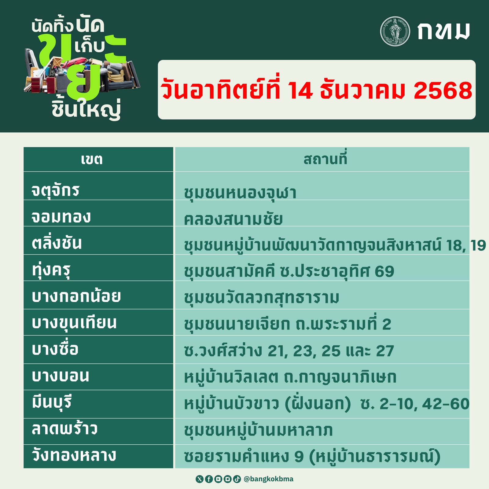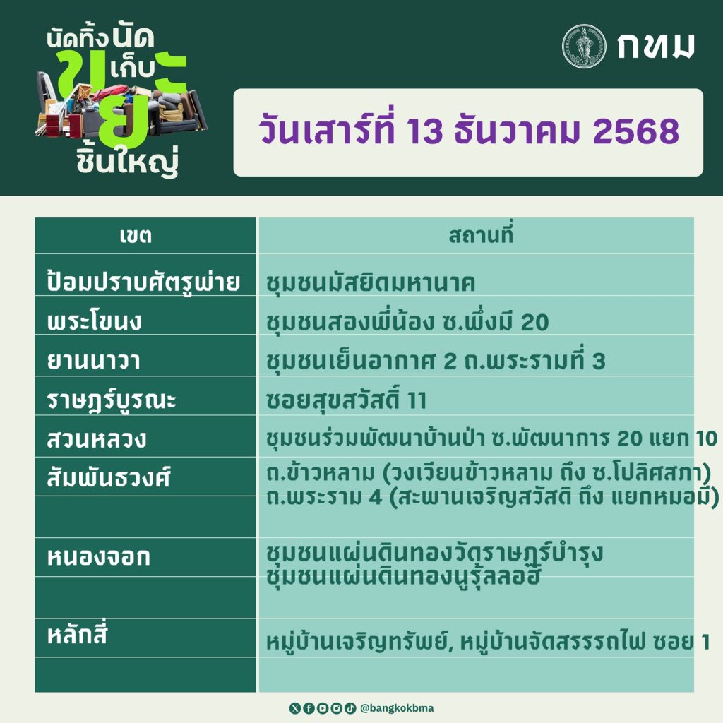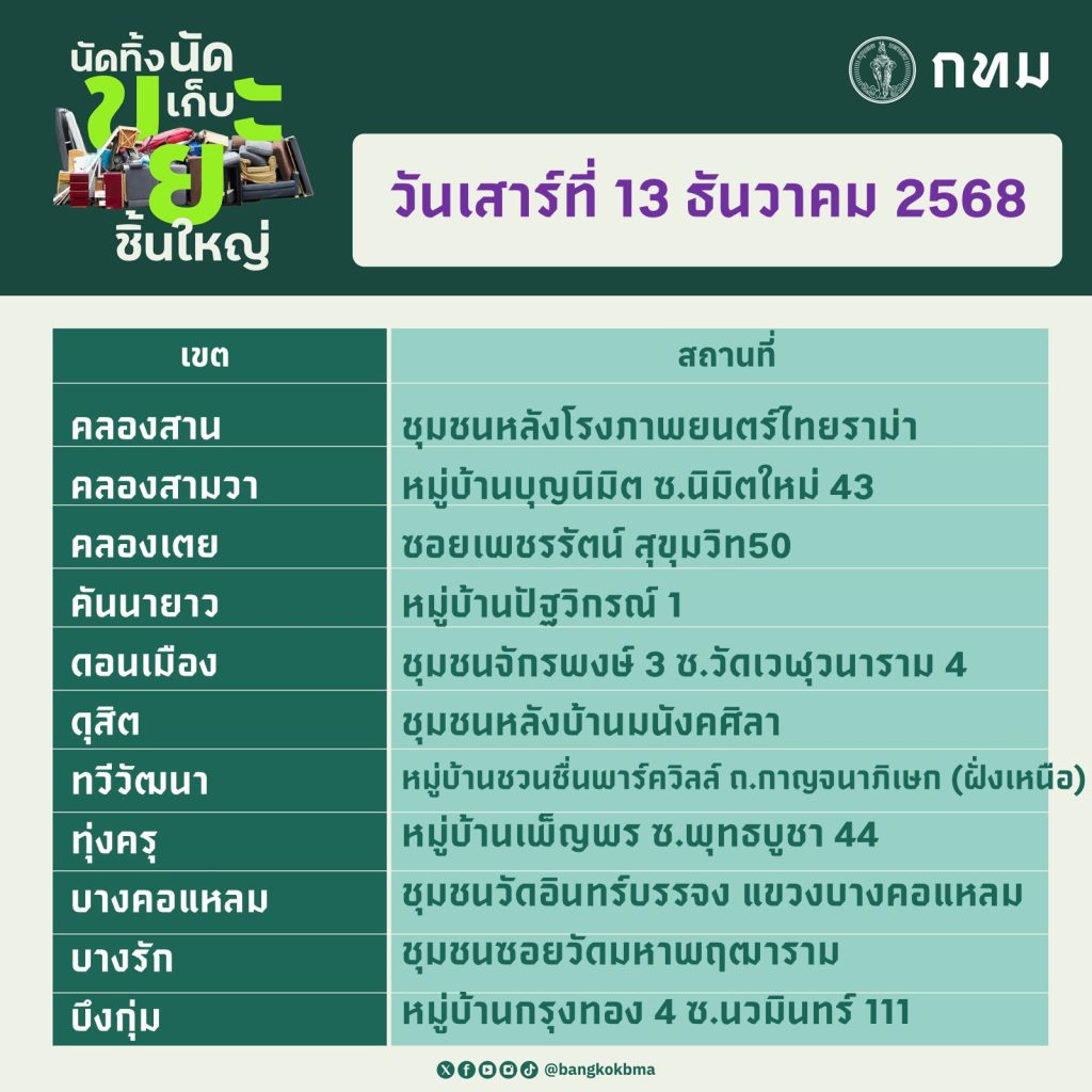 กรุงเทพมหานคร นัดทิ้งนัดเก็บขยะชิ้นใหญ่ วันที่ 13 – 14 ธันวาคม 2568