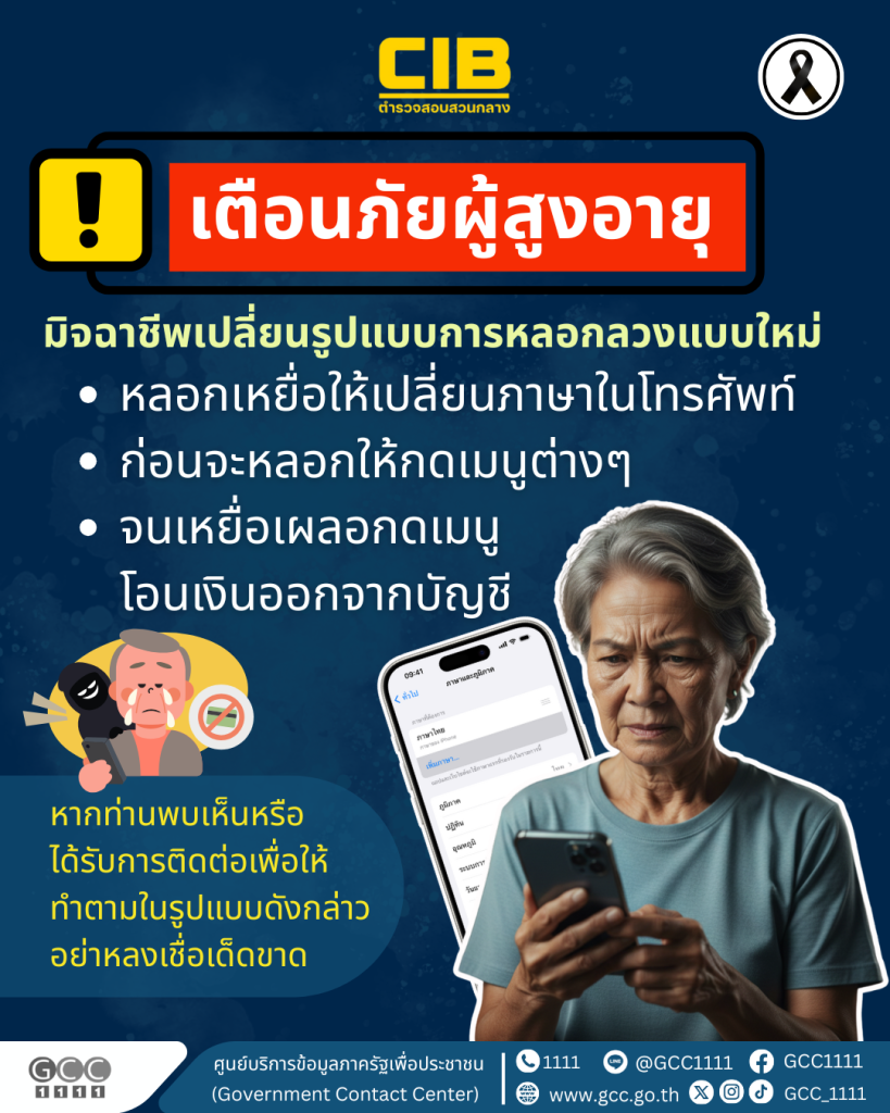 ตำรวจสอบสวนกลาง เตือนภัย มิจฉาชีพเปลี่ยนรูปแบบการหลอกลวงแบบใหม่ “หลอกเหยื่อให้เปลี่ยนภาษาในโทรศัพท์ ก่อนจะหลอกให้กดเมนูต่างๆ จนเหยื่อเผลอกดเมนูโอนเงินออกจากบัญชี ” เป้าหมายของมิจฉาชีพกคือ ผู้สูงวัย วัยเกษียณ หรือผู้สูงอายุที่มีเงินบำเหน็จบำนาญ โดยมิจฉาชีพจะมีการติดต่อไปหาเหยื่อ อ้างเป็นหน่วยงานรัฐหรือหน่วยงานที่เกี่ยวกับเงินบำเหน็จบำนาญ หลอกให้กดเปลี่ยนภาษาในโทรศัพท์ ก่อนพาเข้าแอปธนาคารของเหยื่อ แล้วหลอกให้เหยื่อกดโอนเงิน ซึ่งเหยื่อไม่รู้ตัวว่าถูกหลอกให้กดเมนูอะไร เพราะว่าภาษาของโทรศัพท์ที่มีการเปลี่ยน ทำให้เหยื่อสูญเงินให้กับมิจฉาชีพ