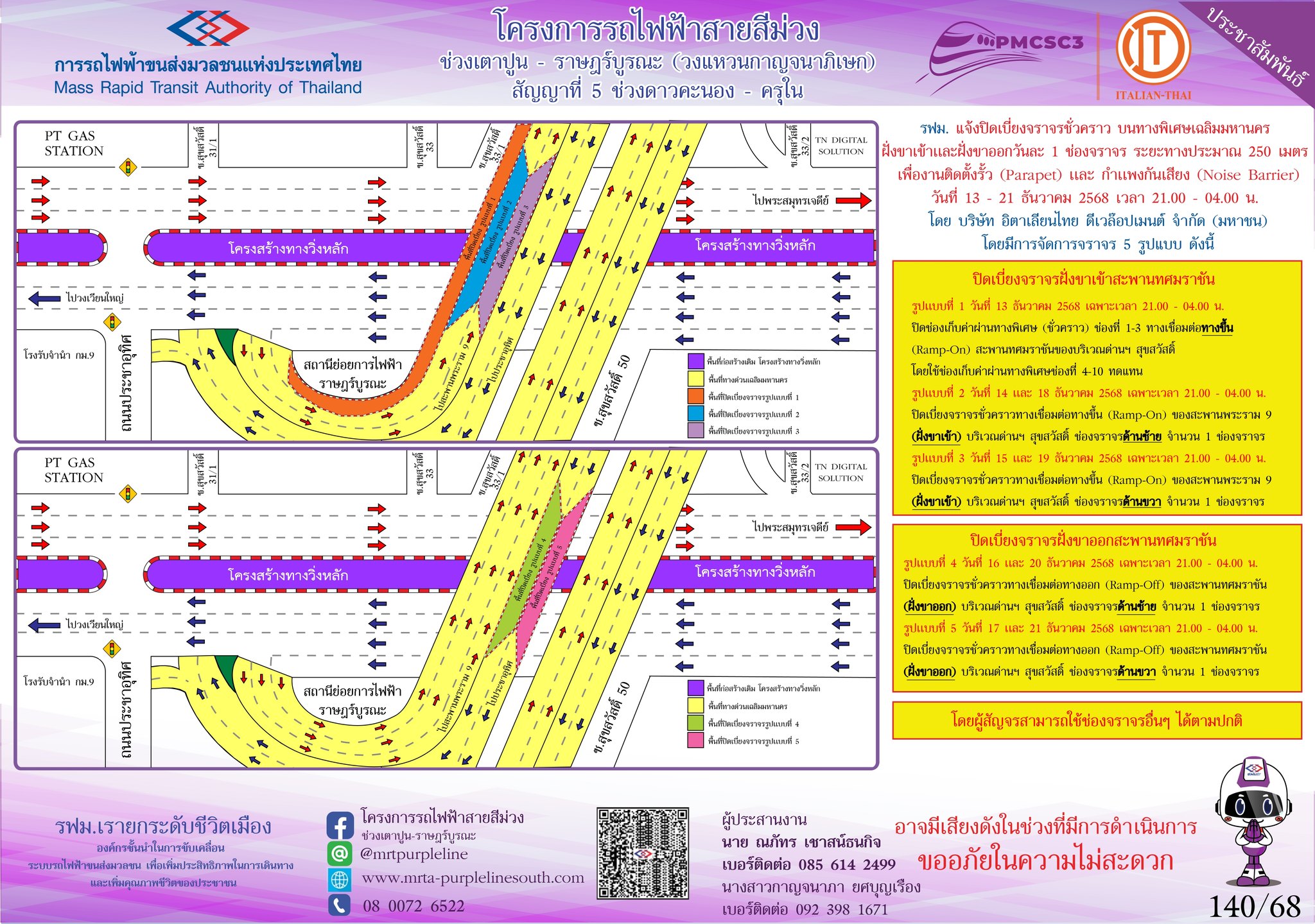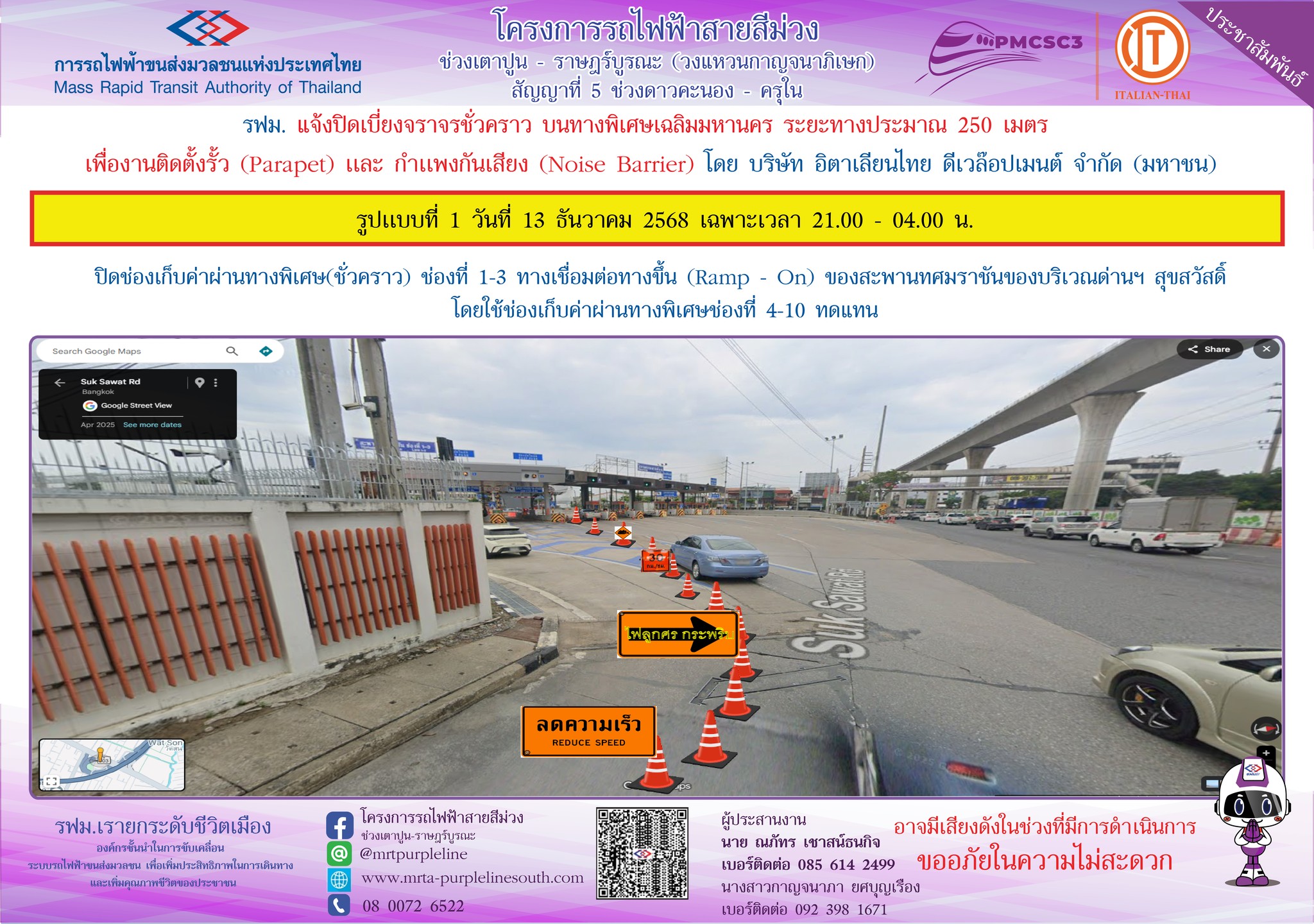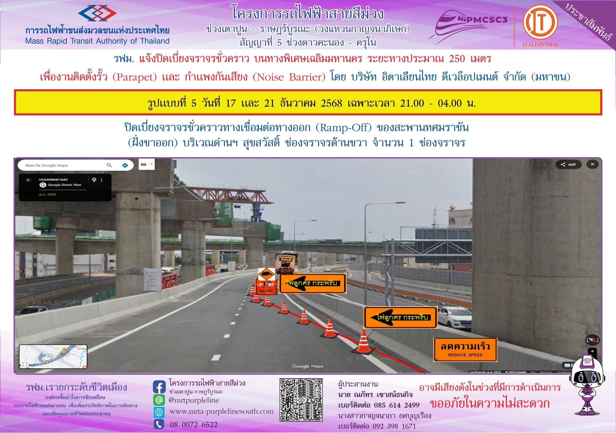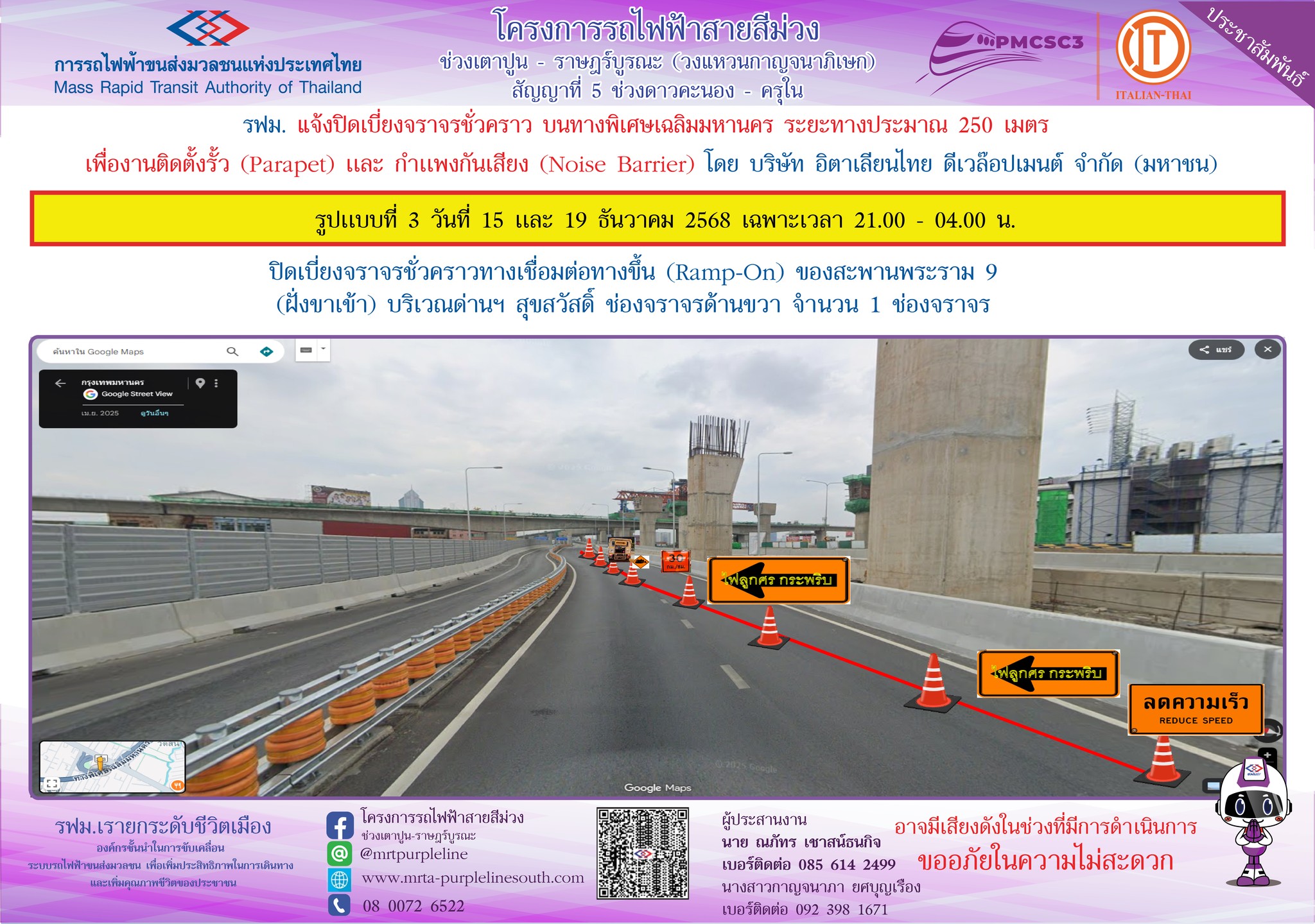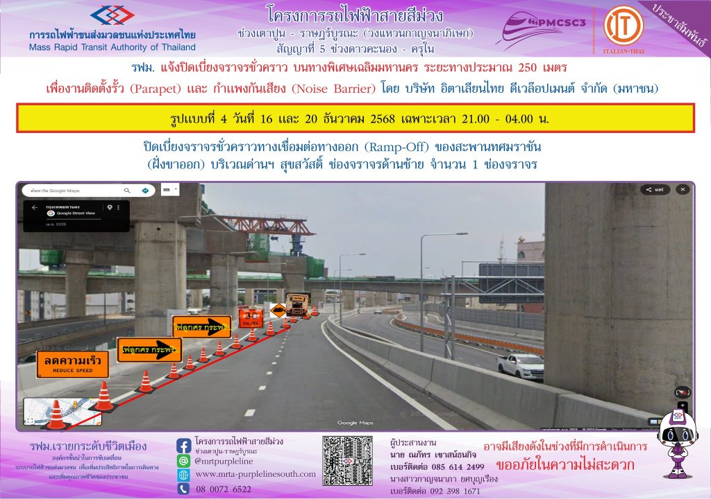 การรถไฟฟ้าขนส่งมวลชนแห่งประเทศไทย แจ้งปิดเบี่ยงจราจรชั่วคราว บนทางพิเศษเฉลิมมหานคร ระยะทางประมาณ 250 เมตร เพื่องานติดตั้งรั้ว (Parapet) และกำแพงกันเสียง (Noise Barrier) ในวันที่ 13 – 21 ธันวาคม 2568 เฉพาะเวลา 21.00 – 04.00 น.