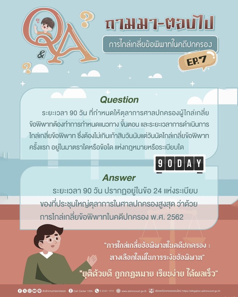 • ถาม: ระยะเวลา 90 วัน ในการกำหนดแนวทาง ขั้นตอน และระยะเวลาการไกล่เกลี่ย อยู่ในกฎหมายหรือระเบียบใด