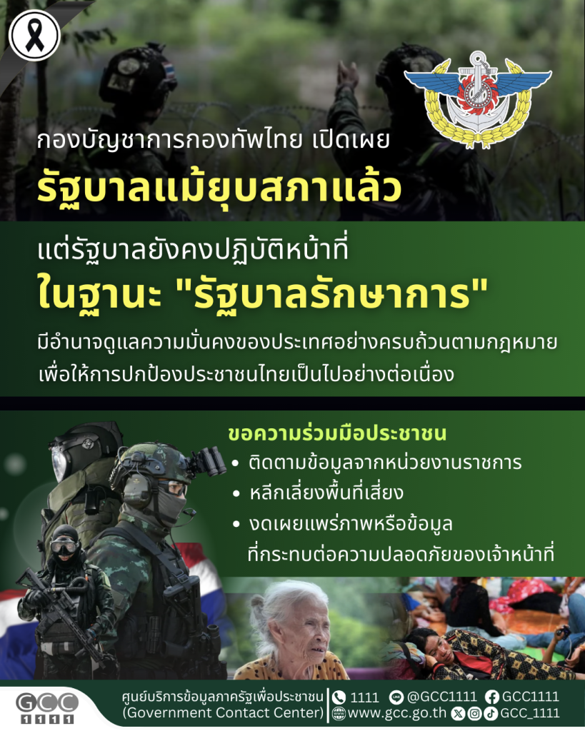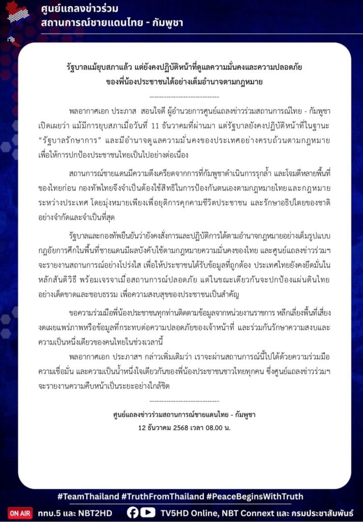 พลอากาศเอก ประภาส สอนใจดี ผู้อำนวยการศูนย์แถลงข่าวร่วมสถานการณ์ไทย – กัมพูชา เปิดเผยว่า แม้มีการยุบสภาเมื่อวันที่ 11 ธันวาคมที่ผ่านมา แต่รัฐบาลยังคงปฏิบัติหน้าที่ในฐานะ “รัฐบาลรักษาการ” และมีอำนาจดูแลความมั่นคงของประเทศอย่างครบถ้วนตามกฎหมาย เพื่อให้การปกป้องประชาชนไทยเป็นไปอย่างต่อเนื่อง