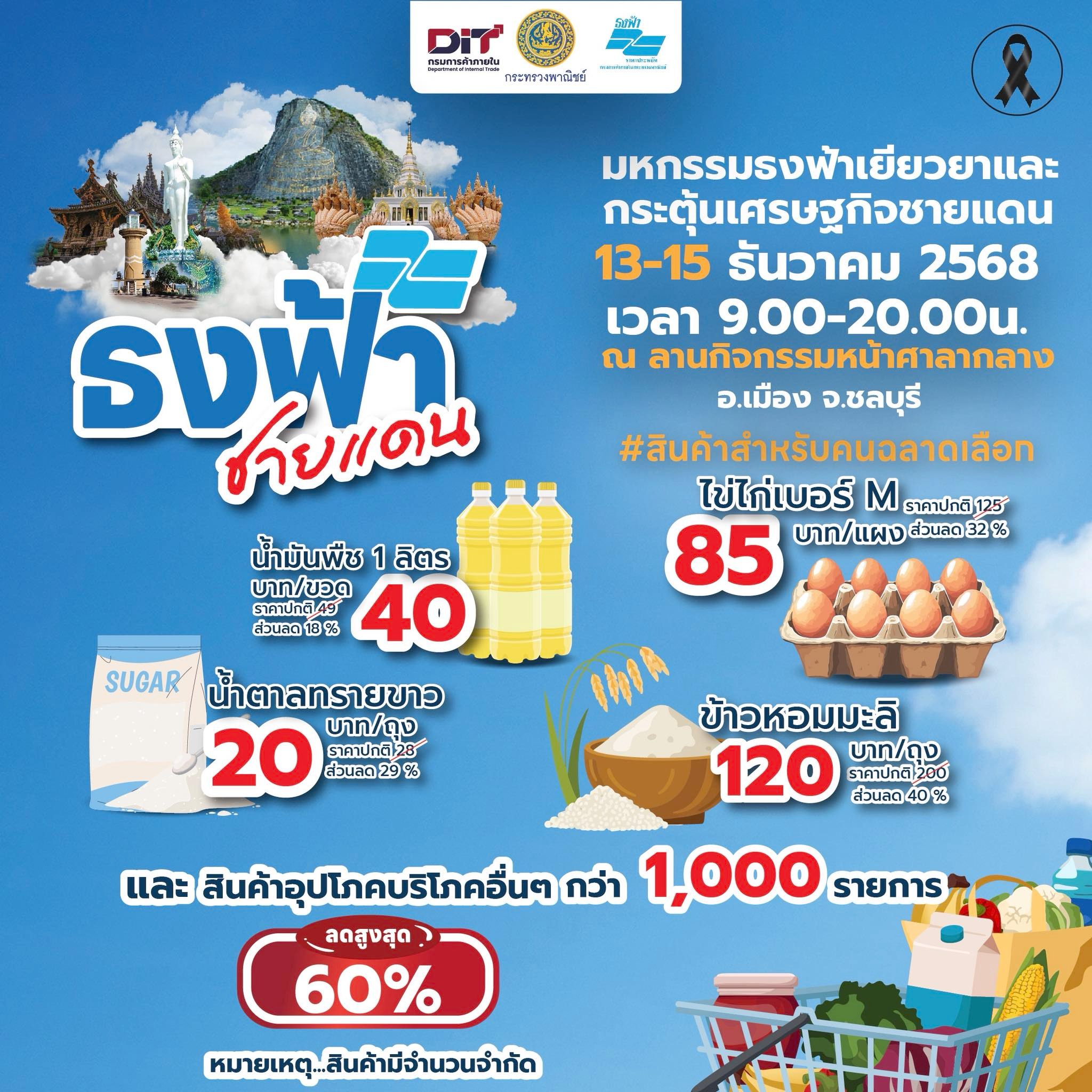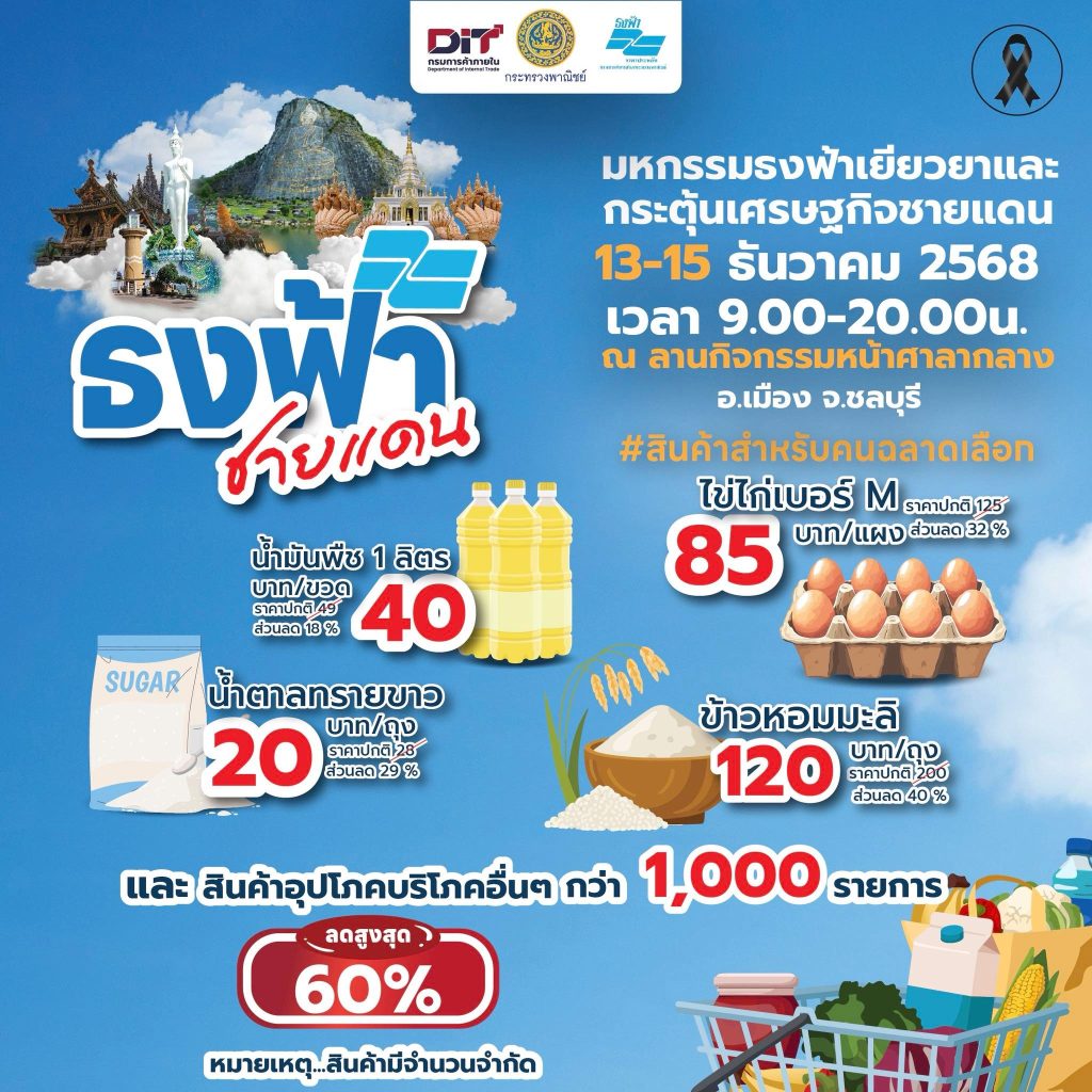 ธงฟ้ามาแล้ว DIT ชวนช้อปในงาน มหกรรมธงฟ้าเยียวยาและกระตุ้นเศรษฐกิจชายแดน วันที่ 13 – 15 ธันวาคม 2568 เวลา 09.00 – 20.00 น. ลานกิจกรรมหน้าศาลากลาง อ.เมือง จ.ชลบุรี จัดเต็ม สินค้าจำเป็นกว่า 1,000 รายการ ลดสูงสุด 60% ช่วยลดภาระค่าครองชีพ