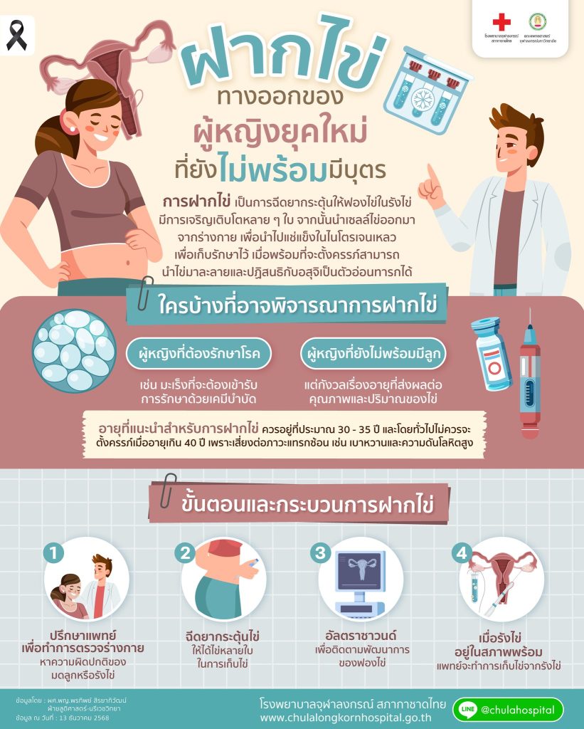 โรงพยาบาลจุฬาลงกรณ์ สภากาชาดไทย แนะนำฝากไข่ ทางออกของผู้หญิงยุคใหม่ที่ยังไม่พร้อมมีบุตร ข่าวสารกิจกรรม โรงพยาบาลจุฬาลงกรณ์ สภากาชาดไทย แนะนำฝากไข่ ทางออกของผู้หญิงยุคใหม่ที่ยังไม่พร้อมมีบุตร ฝากไข่ ทางออกของผู้หญิงยุคใหม่ที่ยังไม่พร้อมมีบุตร การฝากไข่ เป็นการฉีดยากระตุ้นให้ฟองไข่ในรังไข่มีการเจริญเติบโตหลาย ๆ ใบ จากนั้นนำเซลล์ไข่ออกมาจากร่างกาย เพื่อนำไปแช่แข็งในไนโตรเจนเหลวเพื่อเก็บรักษาไว้ เมื่อพร้อมที่จะตั้งครรภ์สามารถนำไข่มาละลายและปฏิสนธิกับอสุจิและเป็นตัวอ่อนทารกได้ ใครบ้างที่อาจพิจารณาการฝากไข่ผู้หญิงที่ต้องรักษาโรค เช่น มะเร็งที่จะต้องเข้ารับการรักษาด้วยเคมีบำบัดผู้หญิงที่ยังไม่พร้อมมีลูก แต่กังวลเรื่องอายุที่ส่งผลต่อคุณภาพและปริมาณของไข่อายุที่แนะนำสำหรับการฝากไข่ ควรอยู่ที่ประมาณ 30 – 35 ปี และโดยทั่วไปไม่ควรจะตั้งครรภ์เมื่ออายุเกิน 40 ปี เพราะเสี่ยงต่อภาวะแทรกซ้อน เช่น เบาหวานและความดันโลหิตสูง ขั้นตอนและกระบวนการฝากไข่ปรึกษาแพทย์เพื่อทำการตรวจร่างกาย หาความผิดปกติของมดลูกหรือรังไข่ฉีดยากระตุ้นไข่ ให้ได้ไข่หลายใบในการเก็บไข่อัลตราซาวนด์ เพื่อติดตามพัฒนาการของฟองไข่เมื่อรังไข่อยู่ในสภาพพร้อม แพทย์จะทำการเก็บไข่จากรังไข่ ที่มา : Facebook : โรงพยาบาลจุฬาลงกรณ์ สภากาชาดไทย Post Views: 23 FacebookFacebookXTwitterLINELine