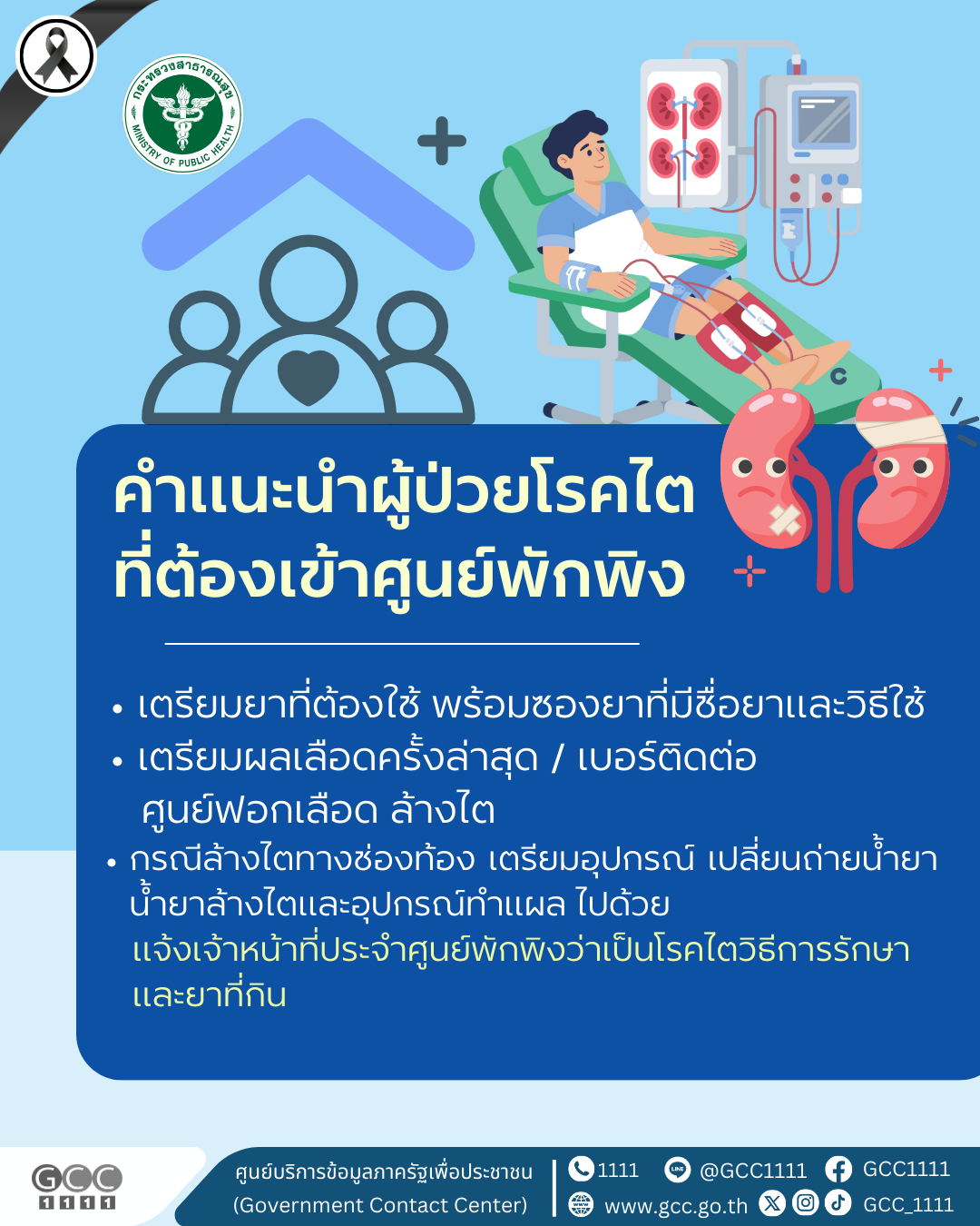 กระทรวงสาธารณสุข แนะนำผู้ป่วยโรคไตที่ต้องเข้าศูนย์พักพิง ดังนี้