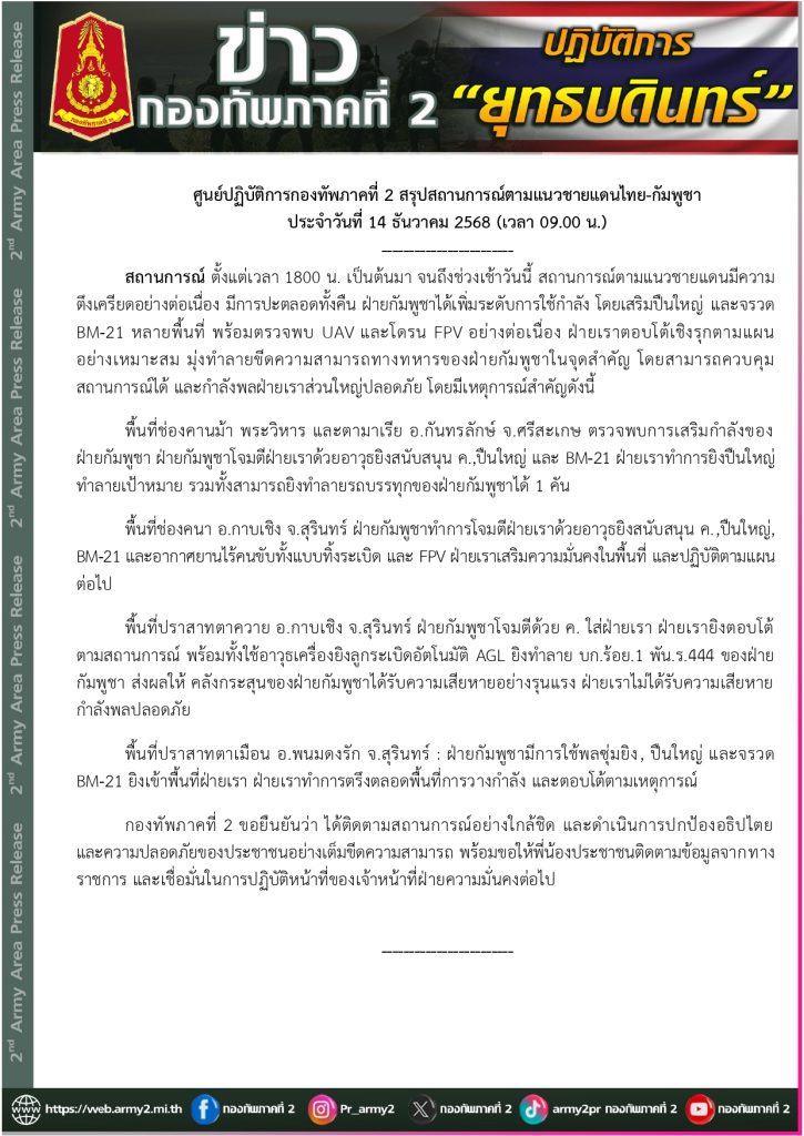 ศูนย์ปฏิบัติการกองทัพภาคที่ 2 สรุปสถานการณ์ตามแนวชายแดนไทย-กัมพูชา ประจำวันที่ 14 ธันวาคม 2568 (เวลา 09.00 น.)