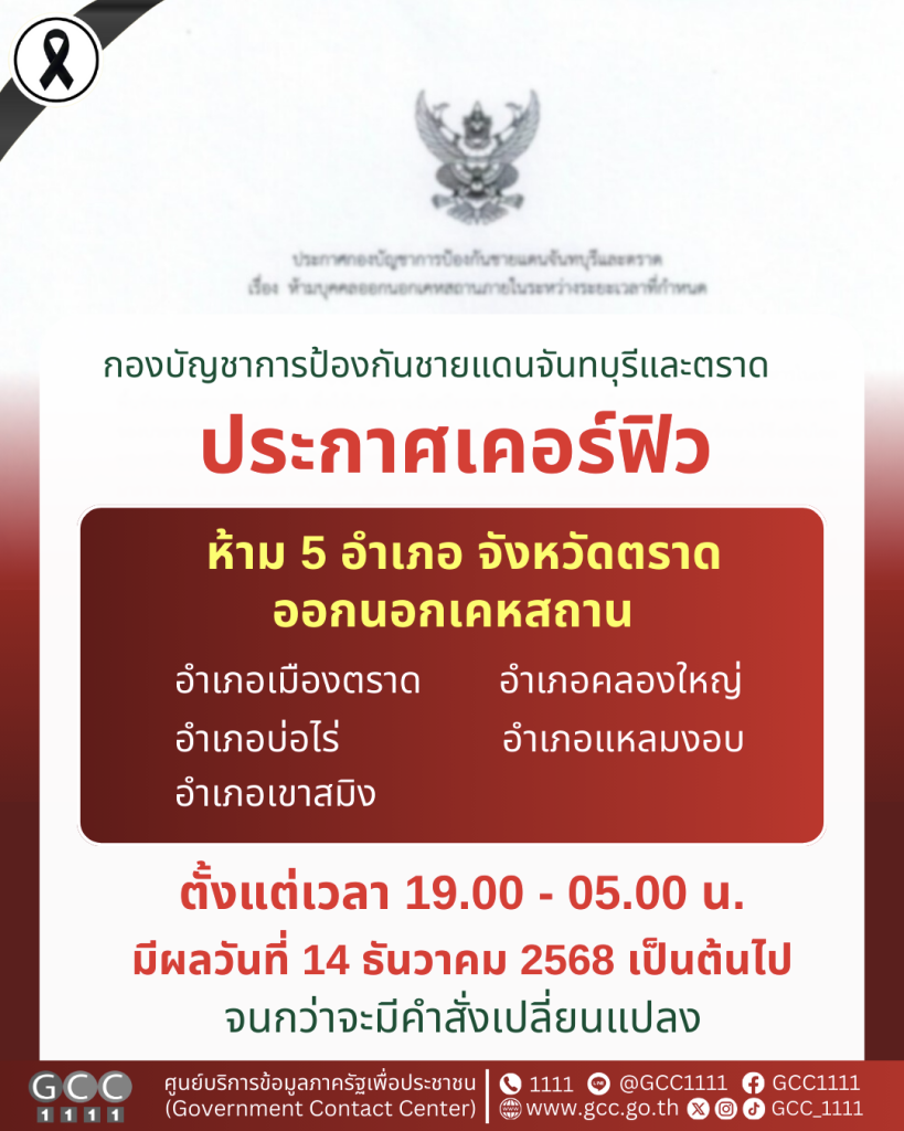 กองบัญชาการป้องกันชายแดนจันทบุรีและตราด ประกาศเคอร์ฟิว ห้าม 5 อำเภอ ออกนอกเคหสถาน ข่าวสารกิจกรรม กองบัญชาการป้องกันชายแดนจันทบุรีและตราด ยกเลิกเคอร์ฟิว 5 อำเภอ จังหวัดตราด กองบัญชาการป้องกันชายแดนจันทบุรีและตราด ประกาศยกเลิกเคอร์ฟิว 5 อำเภอ จังหวัดตราด เนื่องจากสถานการณ์ในพื้นอยู่ในระดับที่สามารถควบคุมได้แล้ว ได้แก่อำเภอเมืองตราดอำเภอคลองใหญ่อำเภอบ่อไร่อำเภอแหลมงอบอำเภอเขาสมิง มีผลตั้งแต่วันที่ 16 ธันวาคม 2568 เป็นต้นไป ประกาศกองบัญชาการป้องกันชายแดนจันทบุรีและตราต เรื่อง ยกเลิกประกาศห้ามบุคคลออกนอกเคหสถานภายในระหว่างระยะเวลาที่กำหนด จังหวัดตราด ตามที่กองบัญชาการป้องกันชายแดนจันทบุรีและตราดได้ออกประกาศห้ามบุคคลออกนอกเคหสถานภายในระหว่างระยะเวลาที่กำหนด ในพื้นที่ จังหวัดตราด เฉพาะ อำเภอคลองใหญ่ อำเภอบ่อบ่อไร่ อำเภอแหลมงอบ อำเภอเขาสมิง และอำเภอเมืองตราด ลงวันที่ 14 ธันวาคม พุทธศักราช 2568 นั้น เนื่องจากสถานการณ์ในพื้นที่ที่ปรากฏภัยคุกคามต่อชีวิตและทรัพย์สินของประชาชนจากภายนอกราชอาณาจักรอยู่ในระดับที่สามารถควบคุมได้แล้ว เพื่อเป็นการบรรเทาความเดือดร้อนของประชาชนในการดำเนินชีวิตประจำวัน ส่งเสริมเศรษฐกิจและการท่องเที่ยวของจังหวัด จึงให้ยกเลิกประกาศห้ามบุคคลออกนอกเคหสถานภายในระหว่างระยะเวลาที่กำหนดดังกล่าว ทั้งนี้ ตั้งแต่บัดนี้เป็นต้นไปประกาศ ณ วันที่ 16 ธันวาคม พ.ศ. 2568พลเรือโทอภิชาติ ทรัพย์ประเสริฐผู้บัญชาการป้องกันชายแดนจันทบุรีและตราด ที่มา : Facebook สำนักงานประชาสัมพันธ์จังหวัดตราด Post Views: 104 FacebookFacebookXTwitterLINELine