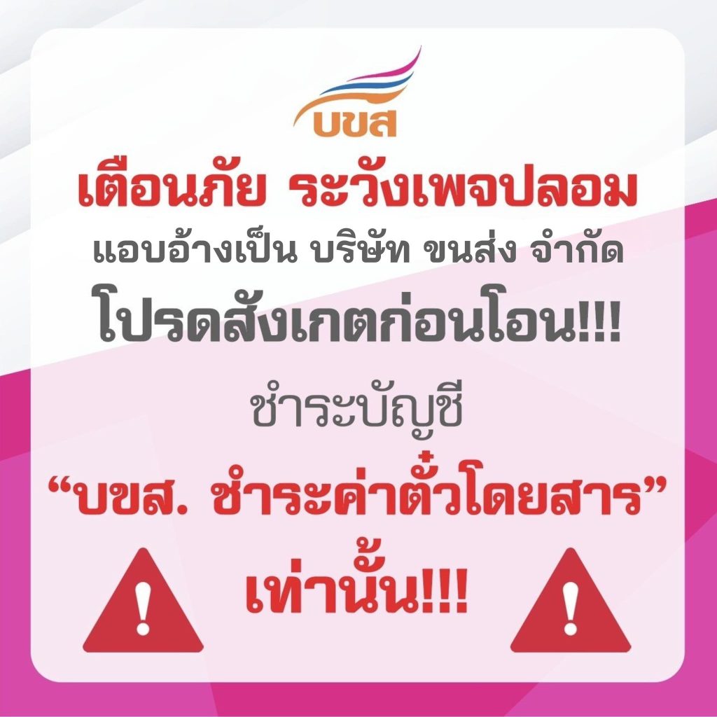บริษัท ขนส่ง จำกัด เตือนระวังเพจปลอม มิจฉาชีพอ้างเป็น บขส. หลอกโอนเงินจ่ายค่าตั๋วออนไลน์
