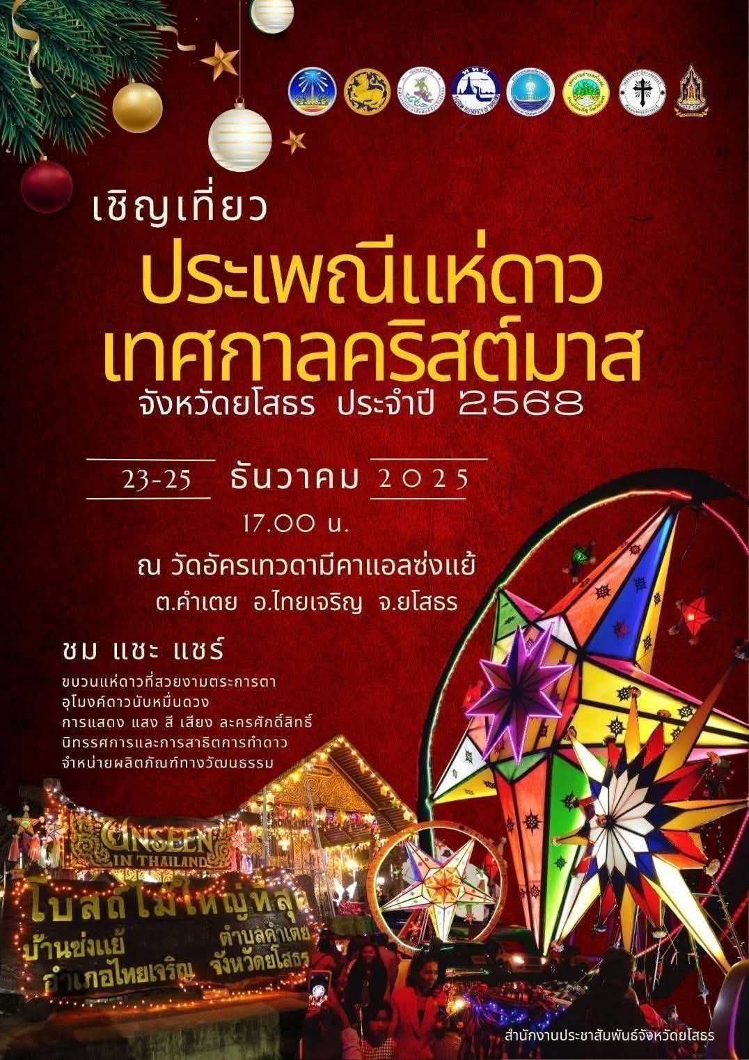 การท่องเที่ยวแห่งประเทศไทย เชิญเที่ยวงานประเพณีแห่ดาวเทศกาลคริสต์มาส จังหวัดยโสธร ประจำปี 2568 ข่าวสารกิจกรรม, ไม่มีหมวดหมู่ การท่องเที่ยวแห่งประเทศไทย เชิญเที่ยวงานประเพณีแห่ดาวเทศกาลคริสต์มาส จังหวัดยโสธร ประจำปี 2568 การท่องเที่ยวแห่งประเทศไทย เชิญเที่ยวงานประเพณีแห่ดาวเทศกาลคริสต์มาส จังหวัดยโสธร ประจำปี 2568 ระหว่างวันที่ 23 – 25 ธันวาคม 2568 ณ วัดอัครเทวดามีคาเเอลซ่งเเย้ โรงเรียนเซนต์มีคาเเอลซ่งเเย้ บ้านซ่งเเย้ ตำบลคำเตย อำเภอไทยเจริญ จังหวัดยโสธร กำหนดการ ดังนี้วันอังคารที่ 23 ธันวาคม 2568ประเพณีเเห่ดาว ชมขบวนแห่ดาวที่สวยสุดตระการตาการแสดงเทศกาลคริสต์มาสนักเรียน โรงเรียนเซนต์มีคาเเอลซ่งเเย้เรื่องละครศักดิ์สิทธิ์ เรื่องราวการบังเกิดของพระเยซูเจ้าชมเเสง สี ประดับโบสถ์ไม้ใหญ่คอนเสิร์ตร่วมสมัย ใหม่ พัชรีวันพุธที่ 24 ธันวาคม 2568พิธีกรรมทางศาสนาพิธีบูชาขอบพระคุณสมโภชพระคริสตสมภพเรื่องละครศักดิ์สิทธิ์ เรื่องราวการบังเกิดของพระเยซูเจ้าชมเเสง สี ประดับโบสถ์ไม้ใหญ่วันพฤหัสที่ 25 ธันวาคม 2568พิธีกรรมทางศาสนาพิธีบูชาขอบพระคุณรุ่งอรุณ สมโภชพระคริสตสมภพจับฉลากบัตรการกุศล โรงเรียนเซนต์มีคาเเอล ซ่งเเย้มหรสพ คณะเเสนเเปดบันเทิงศิลป์ชมเเสง สี ประดับโบสถ์ไม้ใหญ่ ที่มา :Facebook สำนักงานประชาสัมพันธ์จังหวัดยโสธร Facebook ททท.สำนักงานอุบลราชธานี Tat UbonRatchathani Post Views: 5 FacebookFacebookXTwitterLINELine