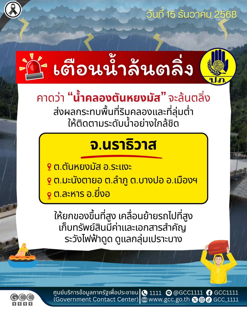 ปภ. แจ้งเตือนน้ำล้นตลิ่งพื้นที่ลุ่มต่ำริมคลองตันหยงมัส กระทบ 3 อำเภอ จ.นราธิวาส ข่าวสารกิจกรรม, สาธารณภัย ปภ. แจ้งเตือนน้ำล้นตลิ่งพื้นที่ลุ่มต่ำริมคลองตันหยงมัส กระทบ 3 อำเภอ จ.นราธิวาส กรมป้องกันและบรรเทาสาธารณภัย แจ้ง“คาดว่าน้ำคลองตันหยงมัสจะล้นตลิ่ง ส่งผลกระทบพื้นที่ริมคลองและที่ลุ่มต่ำ ต.ตันหยงมัส อ.ระแงะ ต.มะนังตายอ ต.ลำภู ต.บางปอ อ.เมืองฯ ต.ละหาร อ.ยี่งอ จ.นราธิวาส ให้ติดตามระดับน้ำอย่างใกล้ชิด ยกของขึ้นที่สูง เคลื่อนย้ายรถไปที่สูง เก็บทรัพย์สินมีค่าและเอกสารสำคัญ ระวังไฟฟ้าดูด ดูแลกลุ่มเปราะบาง” ปภ. จึงได้ร่วมกับผู้ให้บริการเครือข่ายโทรศัพท์เคลื่อนที่ AIS True และ NT ส่งข้อความแจ้งเตือนผ่าน Cell Broadcast แจ้งเตือนน้ำล้นตลิ่งพื้นที่ลุ่มต่ำริมคลองตันหยงมัส อ.ระแงะ อ.เมืองฯ อ.ยี่งอ จ.นราธิวาส ทั้งนี้ สามารถแจ้งเหตุและขอความช่วยเหลือได้ทางไลน์ “ปภ.รับแจ้งเหตุ 1784” เพิ่มเพื่อนที่ Line ID @1784DDPM หรือโทรสายด่วนนิรภัย (ปภ.) 1784 ตลอด 24 ชั่วโมง ที่มา : กรมป้องกันและบรรเทาสาธารณภัย DDPM Post Views: 11 FacebookFacebookXTwitterLINELine