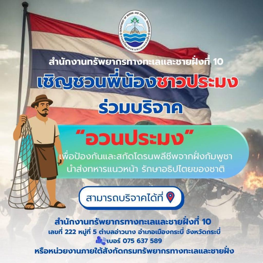 สำนักงานทรัพยากรทางทะเลและชายฝั่งที่ 10 ขอรับบริจาค อวนประมงทุกประเภท เพื่อใช้ในยุทธวิธีทางทหาร ป้องกันและสกัดโดรนพลีชีพจากฝั่งกัมพูชา นำส่งทหารแนวหน้า รักษาอธิปไตยของชาติ