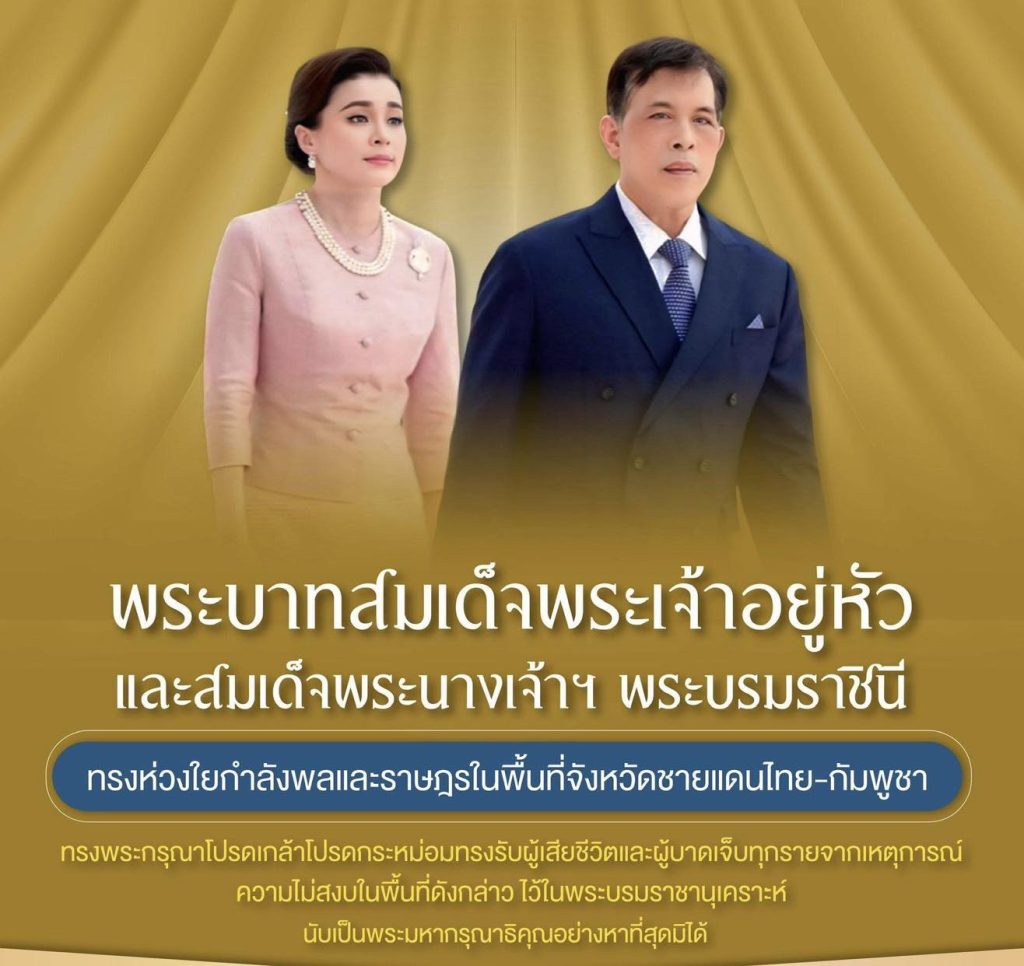 ทั้งสองพระองค์ทรงติดตามสถานการณ์ด้วยความห่วงใยอย่างใกล้ชิด และทรงมีพระราชประสงค์ให้การดูแลช่วยเหลืออย่างรอบด้าน เพื่อบรรเทาความเดือดร้อน ความสูญเสีย และเพื่อเสริมสร้างขวัญและกำลังใจแก่เจ้าหน้าที่ภาคสนาม ซึ่งปฏิบัติหน้าที่ด้วยความกล้าหาญ อดทน และจงรักภักดี เพื่อพิทักษ์รักษาอธิปไตยของชาติและความปลอดภัยของพี่น้องประชาชน