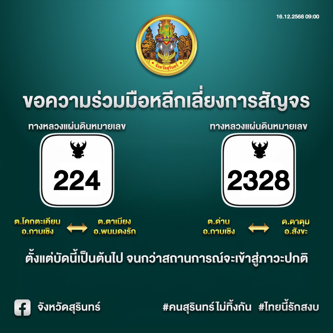 จังหวัดสุรินทร์ ขอความร่วมมือหลีกเลี่ยงการสัญจรทางหลวงหมายเลข 224 และหมายเลข 2328 ตั้งแต่บัดนี้เป็นต้นไป
