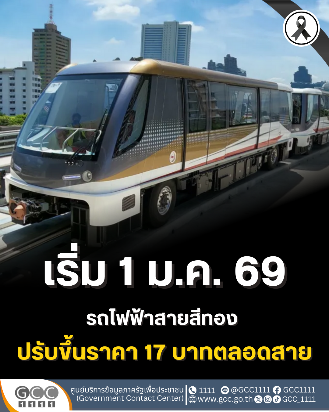 รถไฟฟ้าสายสีทอง ปรับขึ้นค่าโดยสาร 17 บาทตลอดสาย เริ่ม 1 ม.ค. 69 ข่าวสารกิจกรรม รถไฟฟ้าสายสีทอง ปรับขึ้นค่าโดยสาร 17 บาทตลอดสาย เริ่ม 1 ม.ค. 69 กรุงเทพมหานคร และบริษัท กรุงเทพธนาคม จำกัด ปรับค่าโดยสารรถไฟฟ้าสายสีทอง ช่วง กรุงธนบุรี – คลองสาน จากอัตราเดิมที่เรียกเก็บในปัจจุบัน 16 บาทตลอดสาย เป็น 17 บาทตลอดสาย เริ่มตั้งแต่วันที่ 1 มกราคม 2569 เป็นต้นไป บริษัท กรุงเทพธนาคม จำกัด ผู้บริหารจัดการโครงการรถไฟฟ้าสายสีทองระยะที่ 1 (สถานีรถไฟฟ้ากรุงธนบุรี-สำนักงานเขตคลองสาน) ขอแจ้งปรับอัตราค่าโดยสารจากราคา 16 บาทตลอดสาย ปรับเป็น 17 บาทตลอดสาย ตั้งแต่วันที่ 1 มกราคม 2569 ซึ่งเป็นไปตามแผนการบริหารโครงการในส่วนของอัตราค่าโดยสารลดหย่อนเป็นอัตรา 9 บาทตลอดสายสำหรับผู้สูงอายุสัญชาติไทยที่มีอายุตั้งแต่ 60 ปีบริบูรณ์ขึ้นไปผู้โดยสารทหารผ่านศึกตามกำหนดไว้ในกฎหมายว่าด้วยองค์การสงเคราะห์ทหารผ่านศึก และยกเว้นค่าโดยสาร สำหรับเด็กที่มีความสูงไม่เกิน 90 เซนติเมตร และคนพิการที่มีบัตรประจำตัวคนพิการตามกฎหมายว่าด้วยการส่งเสริมและพัฒนาคุณภาพชีวิตคนพิการ ที่มา : Facebook บริษัท กรุงเทพธนาคม จำกัด Post Views: 58 FacebookFacebookXTwitterLINELine