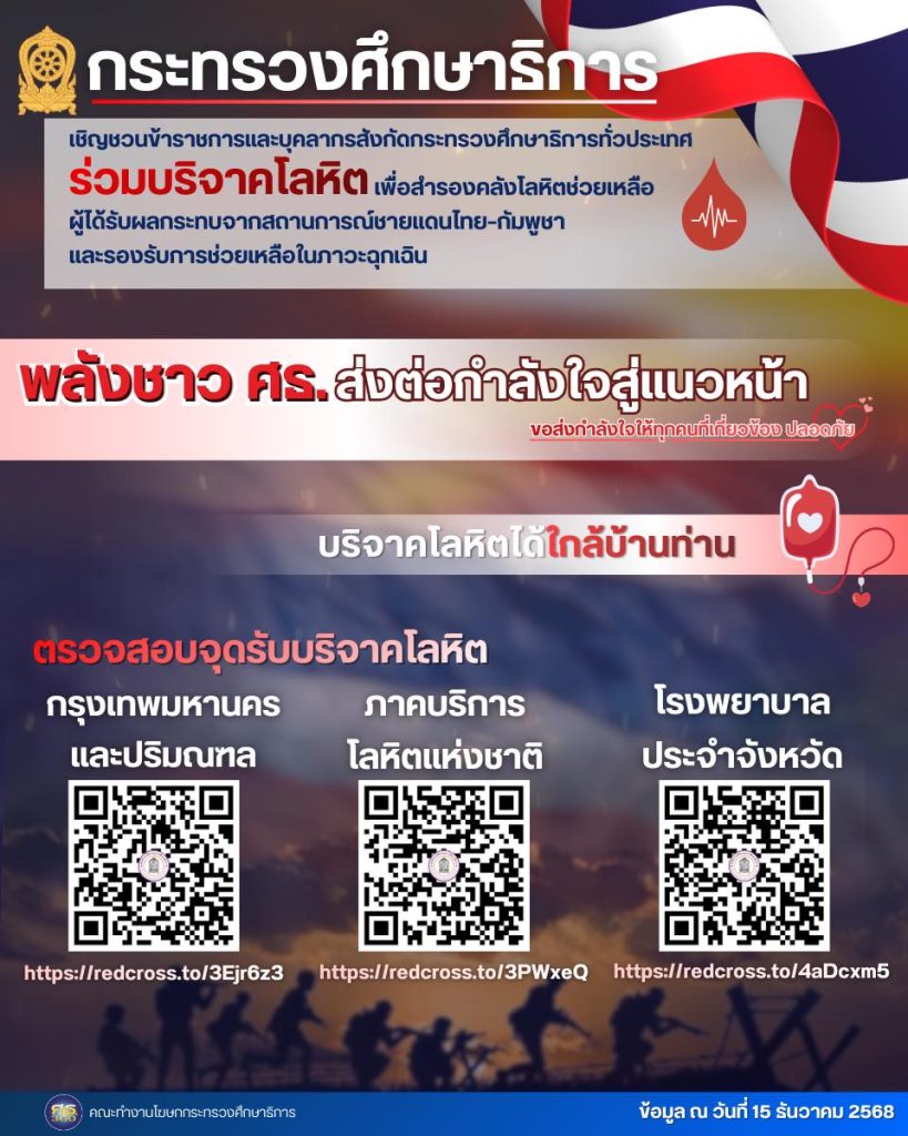 กระทรวงศึกษาธิการ เชิญชวนข้าราชการและบุคลากร สังกัดกระทรวงศึกษาธิการทั่วประเทศ ร่วมบริจาคโลหิต เพื่อสำรองคลังโลหิตช่วยเหลือผู้ป่วยและโรงพยาบาล จากสถานการณ์ชายแดนไทย–กัมพูชา และรองรับการช่วยเหลือในภาวะฉุกเฉิน