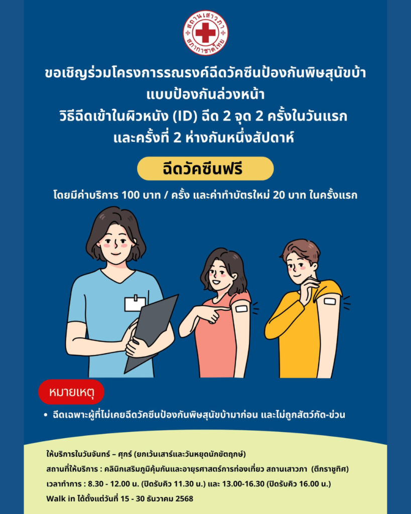 สภากาชาดไทย ขอเชิญร่วมโครงการรณรงค์ฉีดวัคซีนป้องกันพิษสุนัขบ้า แบบป้องกันล่วงหน้า (ฟรี)