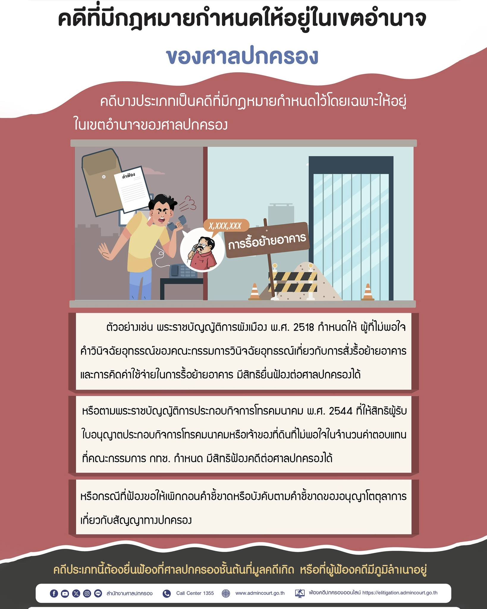 สอบถามข้อมูลหรือปรึกษาข้อกฎหมายเกี่ยวกับคดีปกครองได้ที่ สายด่วนศาลปกครอง 1355 (ในวันและเวลาราชการ)
