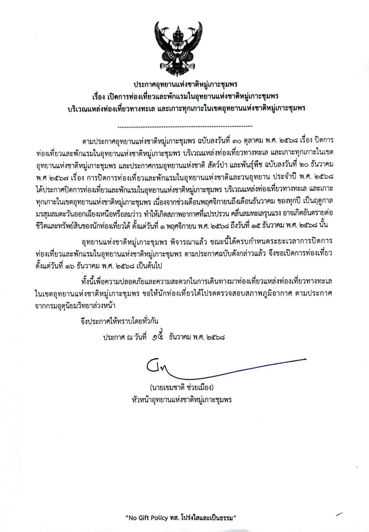 อุทยานแห่งชาติหมู่เกาะชุมพร พิจารณาแล้ว ขณะนี้ได้ครบกําหนดระยะเวลาการปิดการ ท่องเที่ยวและพักแรมในอุทยานแห่งชาติหมู่เกาะชุมพร ตามประกาศฉบับดังกล่าวแล้ว จึงขอเปิดการท่องเที่ยว ตั้งแต่วันที่ 16 ธันวาคม พ.ศ. 2568 เป็นต้นไป