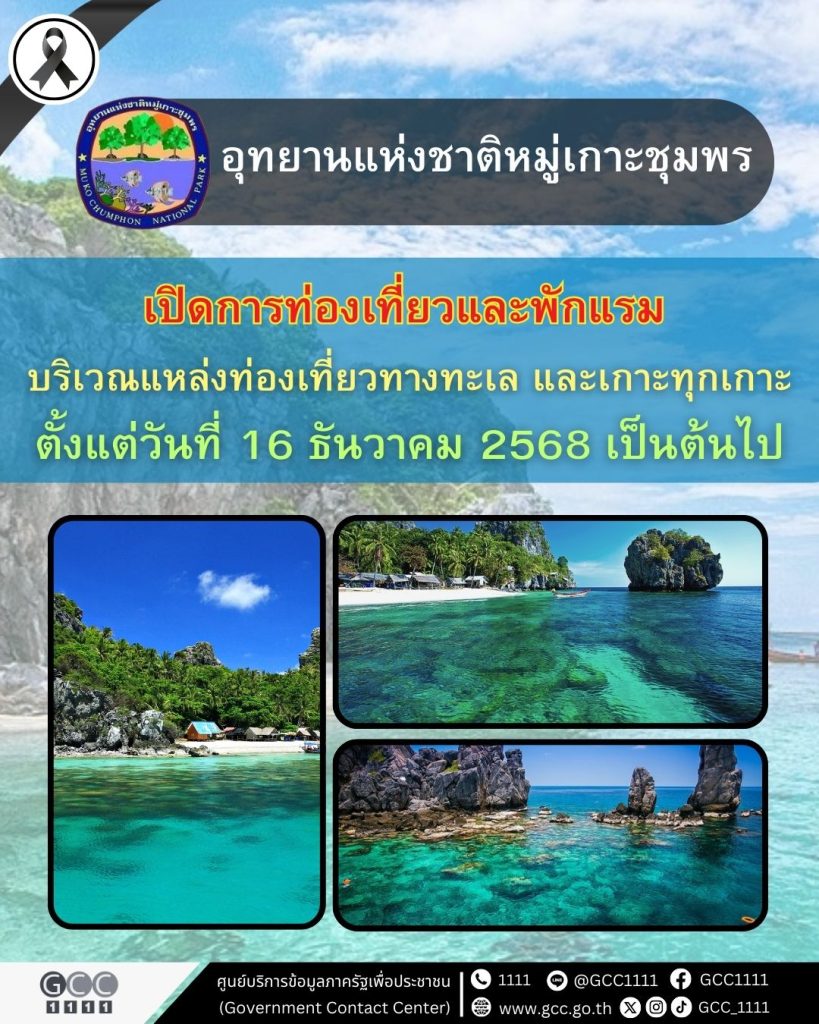 อุทยานแห่งชาติหมู่เกาะชุมพร เปิดการท่องเที่ยวและพักแรม บริเวณแหล่งท่องเที่ยวทางทะเล และเกาะทุกเกาะในเขตอุทยานแห่งชาติหมู่เกาะชุมพร ตั้งแต่วันที่ 16 ธันวาคม 2568 เป็นต้นไป