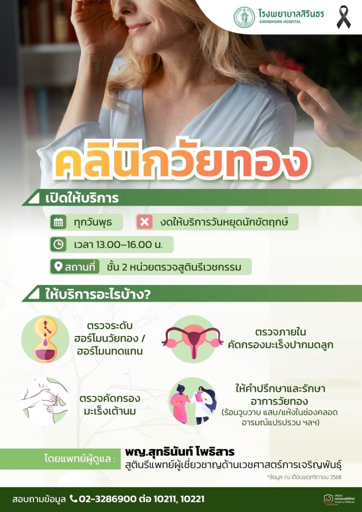 โรงพยาบาลสิรินธร เปิดให้บริการ “คลินิกวัยทอง” ข่าวสารกิจกรรม โรงพยาบาลสิรินธร เปิดให้บริการ “คลินิกวัยทอง” โรงพยาบาลสิรินธร เปิดให้บริการ “คลินิกวัยทอง” เปิดให้บริการทุกวันพุธ เวลา 13.00 – 16.00 น. สถานที่ ชั้น 2 หน่วยตรวจสูตินรีเวชกรรม งดให้บริการในวันหยุดนักขัตฤกษ์ โรงพยาบาลสิรินธร เปิดให้บริการ “คลินิกวัยทอง” ดูแลสุขภาพผู้หญิงอย่างครบวงจร ใส่ใจทุกการเปลี่ยนแปลงในช่วงวัย เปิดให้บริการทุกวันพุธ เวลา 13.00 – 16.00 น. สถานที่ ชั้น 2 หน่วยตรวจสูตินรีเวชกรรม งดให้บริการในวันหยุดนักขัตฤกษ์ให้บริการอะไรบ้างตรวจระดับฮอร์โมนวัยทอง / ฮอร์โมนทดแทนตรวจภายใน คัดกรองมะเร็งปากมดลูกตรวจคัดกรองมะเร็งเต้านมให้คำปรึกษาและรักษาอาการวัยทอง (เช่น ร้อนวูบวาบ แสบ/แห้งในช่องคลอด อารมณ์แปรปรวน ฯลฯ) ดูแลโดยแพทย์ผู้เชี่ยวชาญ พญ.สุทธินันท์ โพธิสาร สูตินรีแพทย์ผู้เชี่ยวชาญด้านเวชศาสตร์การเจริญพันธุ์ สอบถามข้อมูลเพิ่มเติม โทร. 0 2328 6900 ต่อ 10211, 10221 ที่มา : Facebook โรงพยาบาลสิรินธร สำนักการแพทย์ กรุงเทพมหานคร Post Views: 71 FacebookFacebookXTwitterLINELine