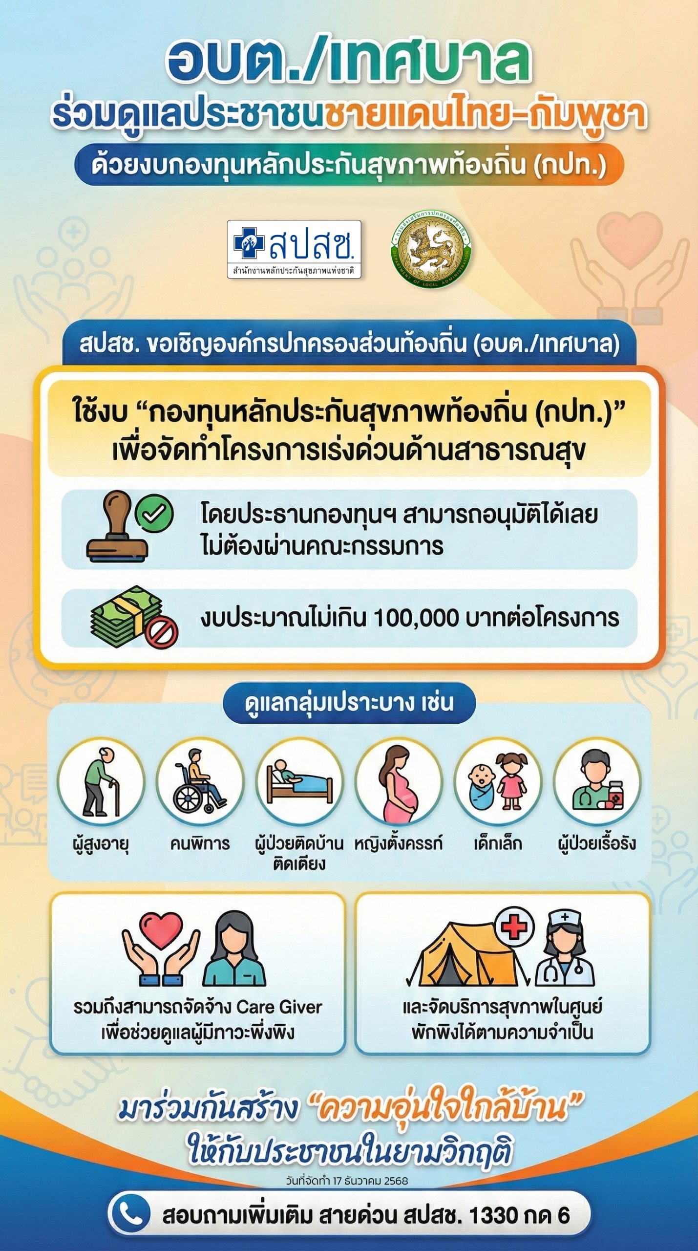 สปสช. สนับสนุน อบต. และเทศบาล ใช้กลไก กองทุนหลักประกันสุขภาพท้องถิ่น (กปท.) จัดทำโครงการดูแลสุขภาพประชาชนในพื้นที่ความไม่สงบชายแดนไทย-กัมพูชา ให้เข้าถึงบริการสาธารณสุขที่จำเป็นได้ ในงบไม่เกิน 1 แสนบาท